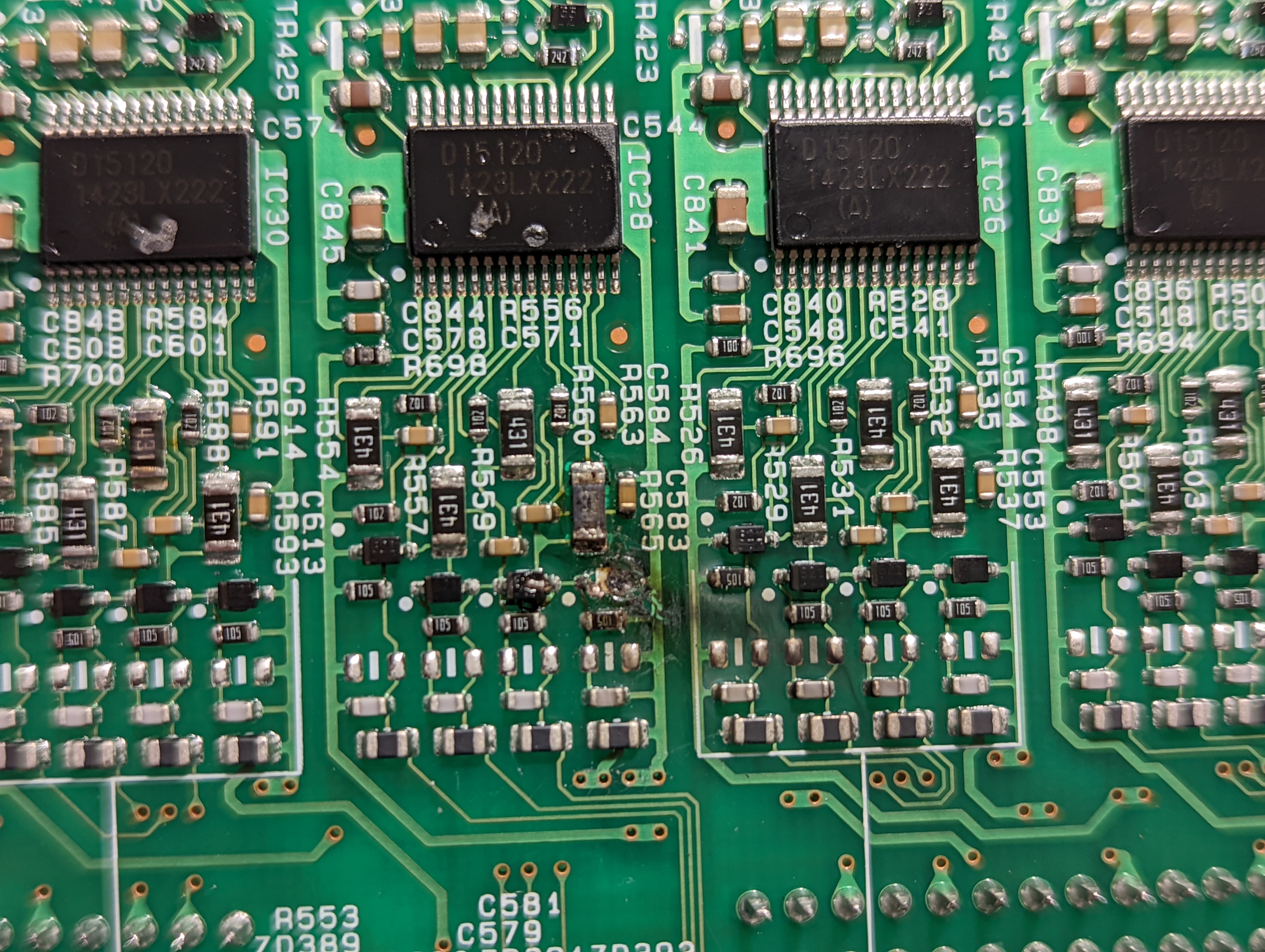 Now I checked that BMS that has faulty values on cells 73-75. Turns out the small front end diode had blown on the 1st channel of IC28 (cell 73 tap). I assume that channel of the acquisition IC is blown as well but it shows no blowhole.