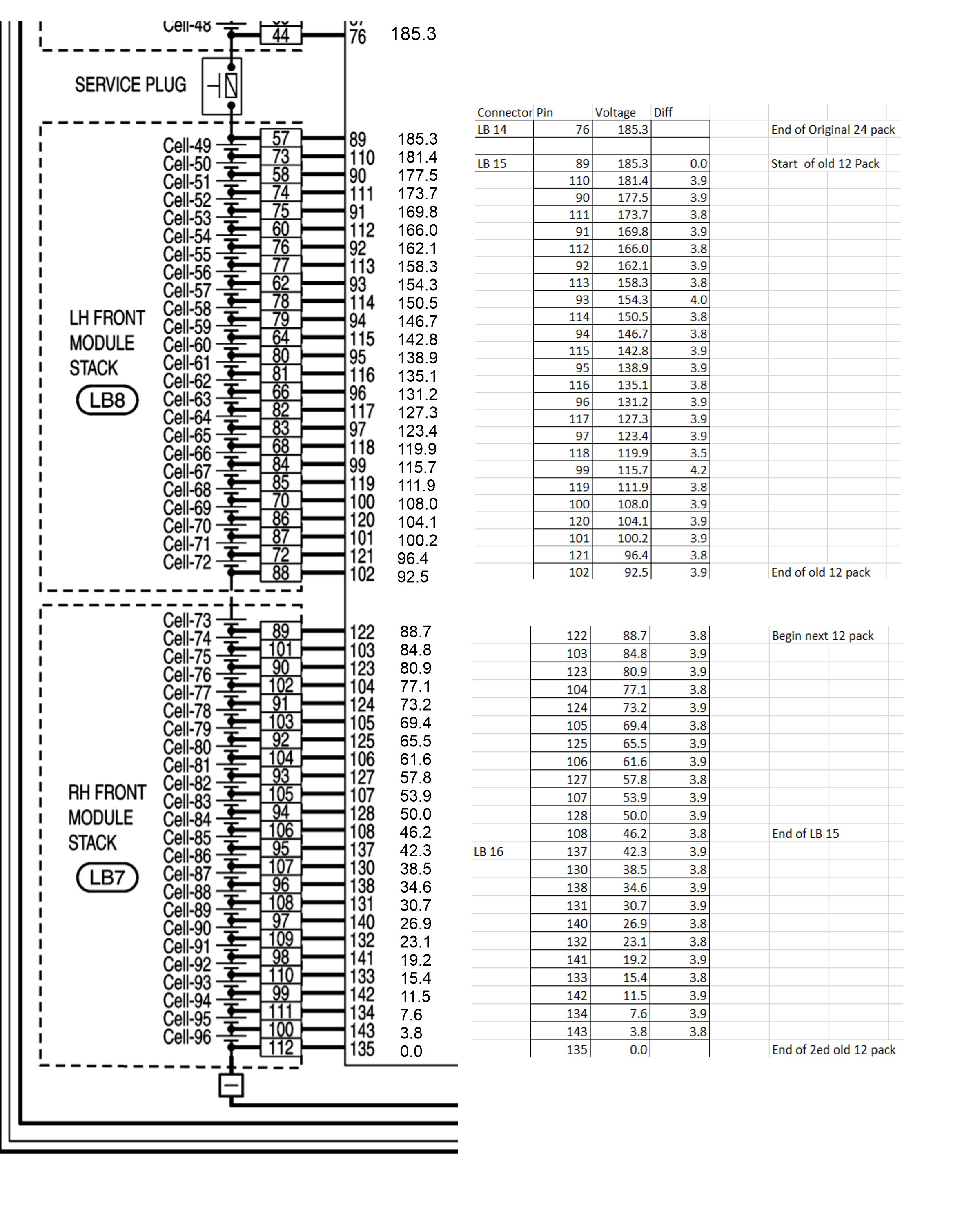 Obviously on the HV side of things the wiring of the buss bars seems to be correct. I even was able to charge the pack. But because I cant see individual cell voltages in the Sequence I must have done something wrong in the sense wiring. As I am not a Electrical Engineer, merely an old technician, I asked a friend who is a EE to take a look and confirm what he could as to my sense rewire job. Here is his report: