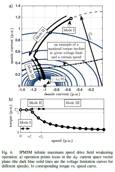 Now, these modes seem to be only or mostly dependent on motor speed and there's no information on what the speeds would be. Given that moving current from Iq to Id increased performance when starting from about a 1:1 distribution at 2300rpm, I would reason 2300rpm is close below to the mode 2 to mode 3 transition point. Maybe the transition point is somewhere between 2500-3000rpm.