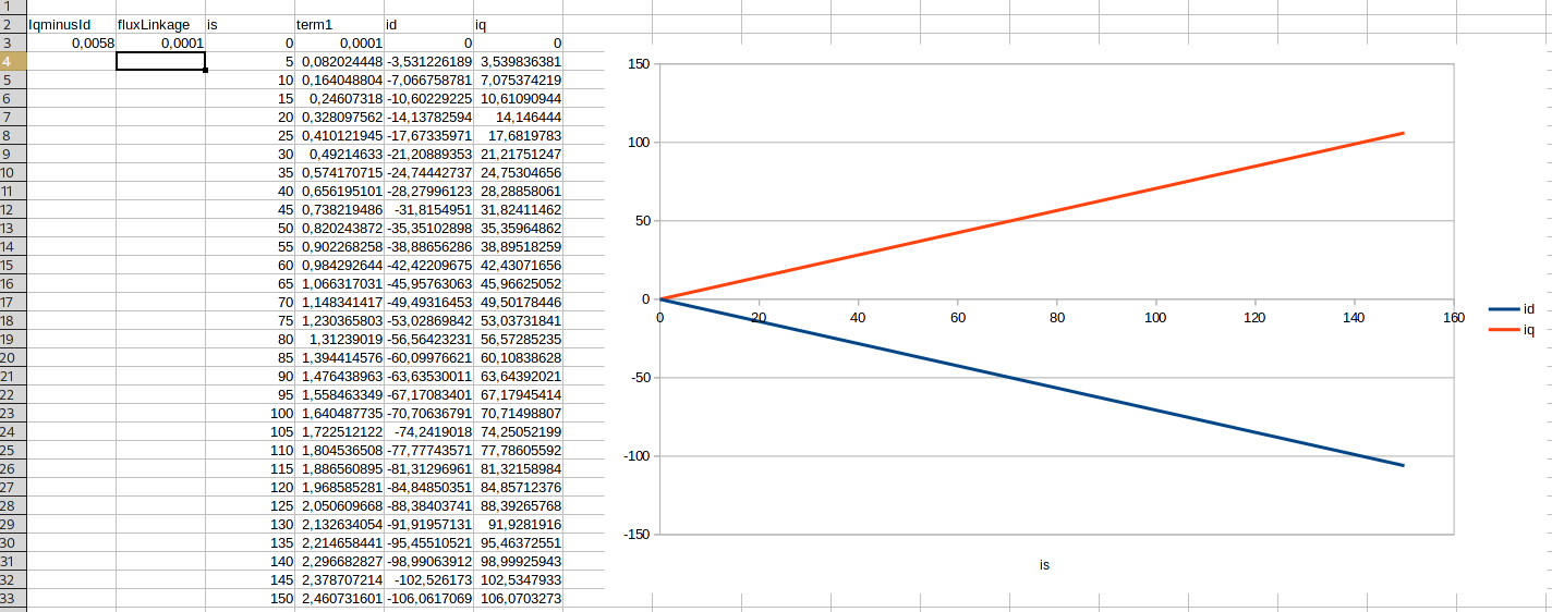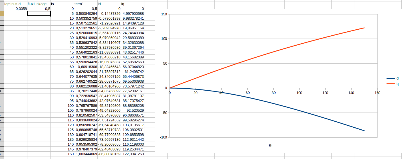 So I don't know what to conclude. Is TIs formula wrong? Or do we not understand it correctly? A formula that hardly responds to its input parameters doesn't seem very useful. I think I will make a firmware with "our" interpretation of MTPA and have fluxLinkage be a parameter.