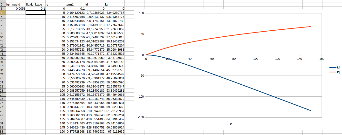 And lets come to that. I have played around with the MTPA formula and I find it a bit weird. If I leave it like it is, changing lqminusld and fluxLinkage actually make a difference. If I change it to the one advertised by TI or Mathworks, it always results in a pretty linear 50:50 distribution of id and iq
