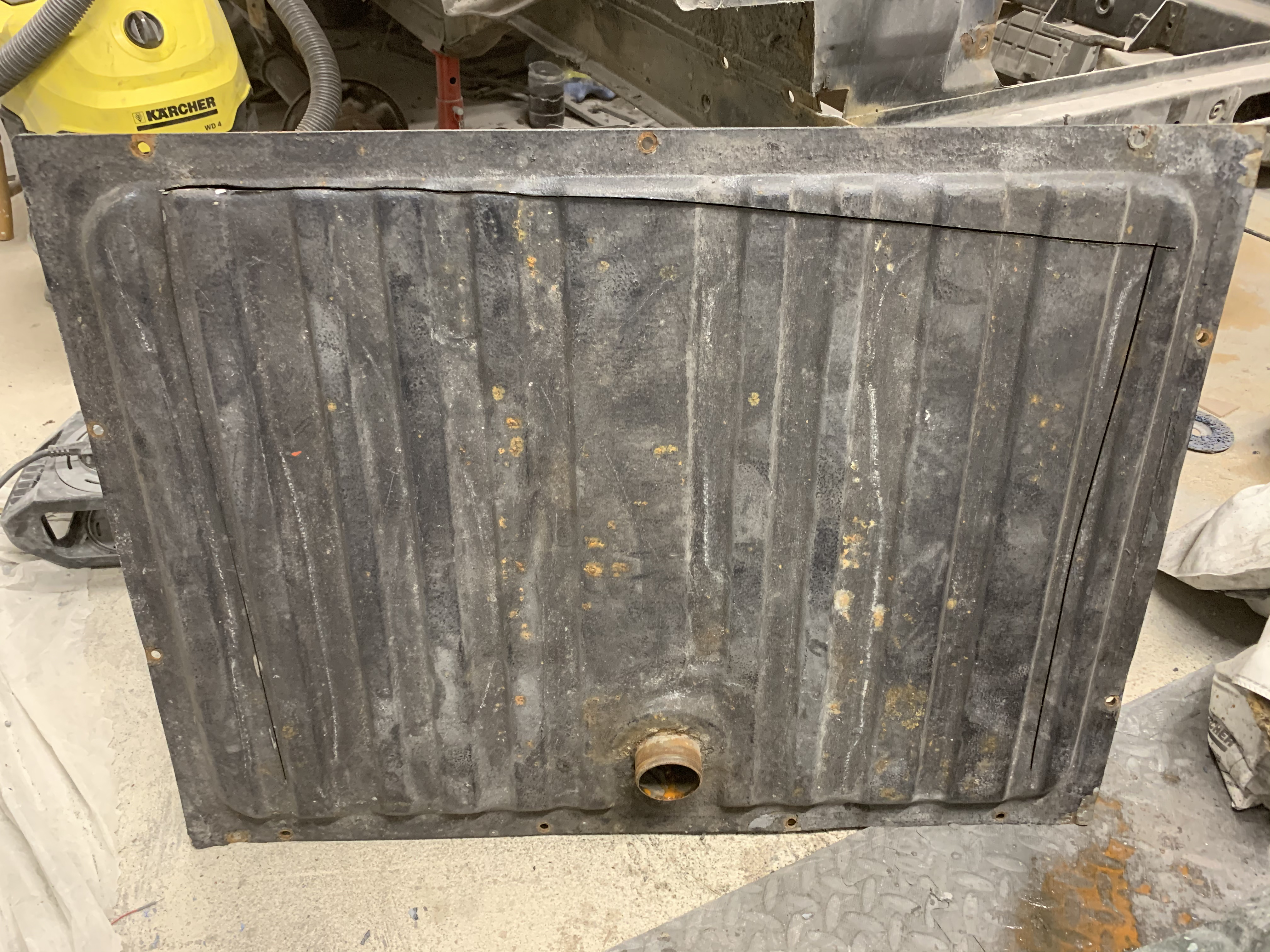 First I cut the top off the fuel tank. It had some pretty foul sludge in the bottom. It's also pretty banged up. If I'm going to use it I'll have to hammer some of that out.