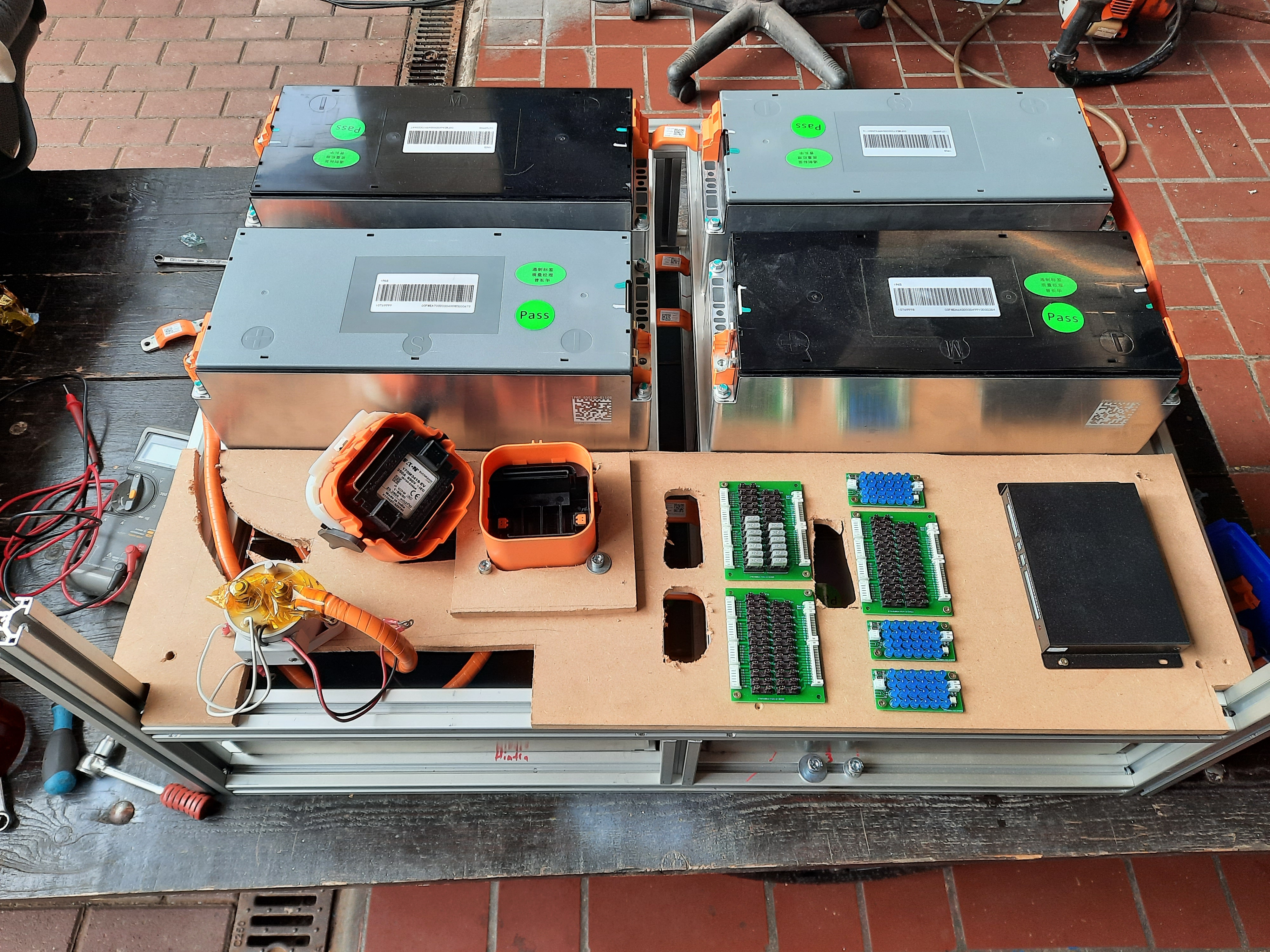 The battery boxes are coming together nicely and at least the front box is nearing completion: I used 30x30mm aluminum profiles for the outer structure which will later be embedded in a fiberglass shell. I can reuse a lot of the original bus bars from the MG ZS although some custom cables are required and right now, I only have to wait for some cable lugs to arrive to finish the boxes. (Don't mind the prototyping particle boards, they will be replaced