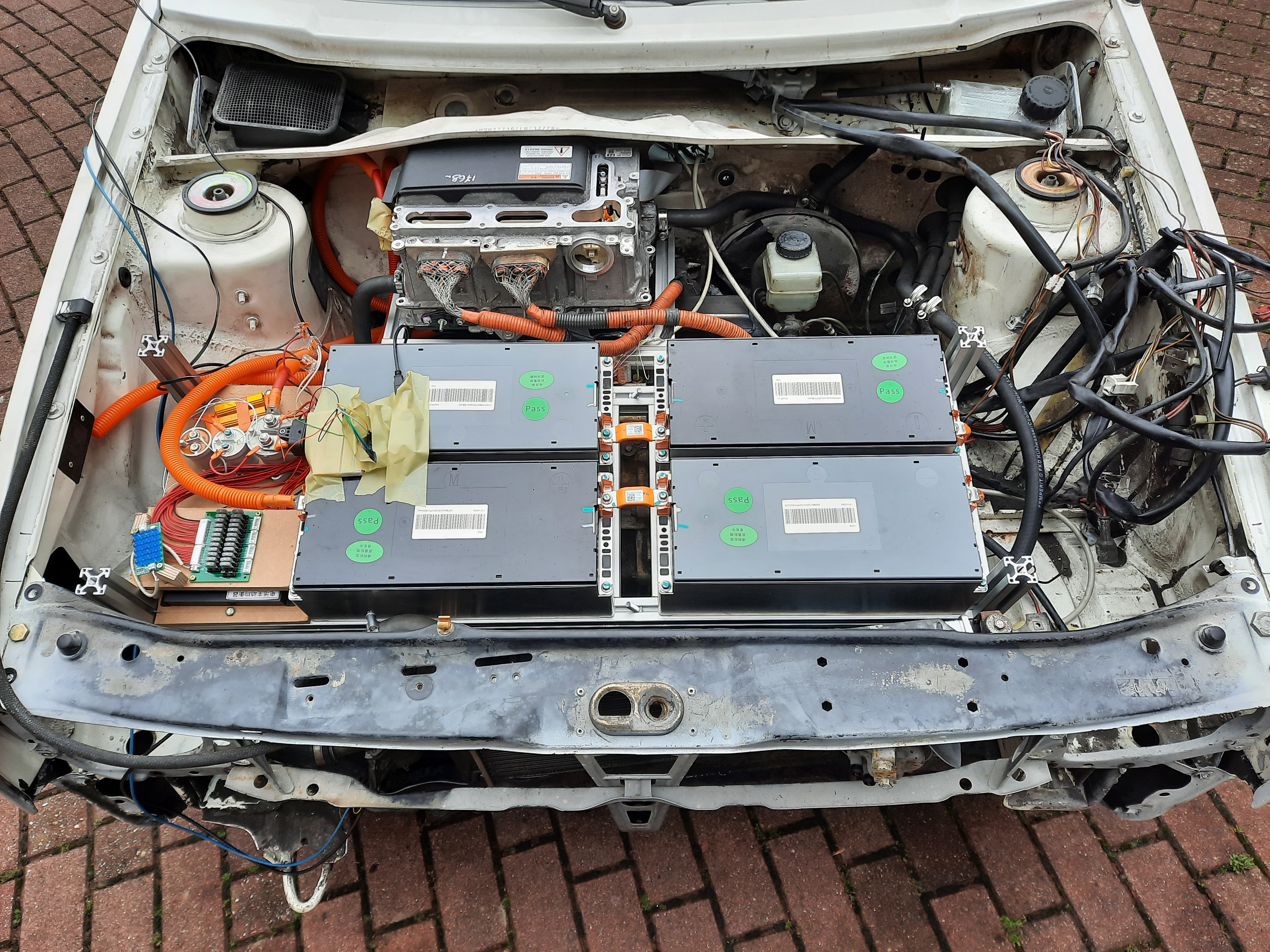 The next step will be implementing the real HV battery, 16 of the 18 modules from a MG ZS EV. This makes it a 96s system with ~40kWh. 4 of those modules will go into the front, the rest in the trunk.