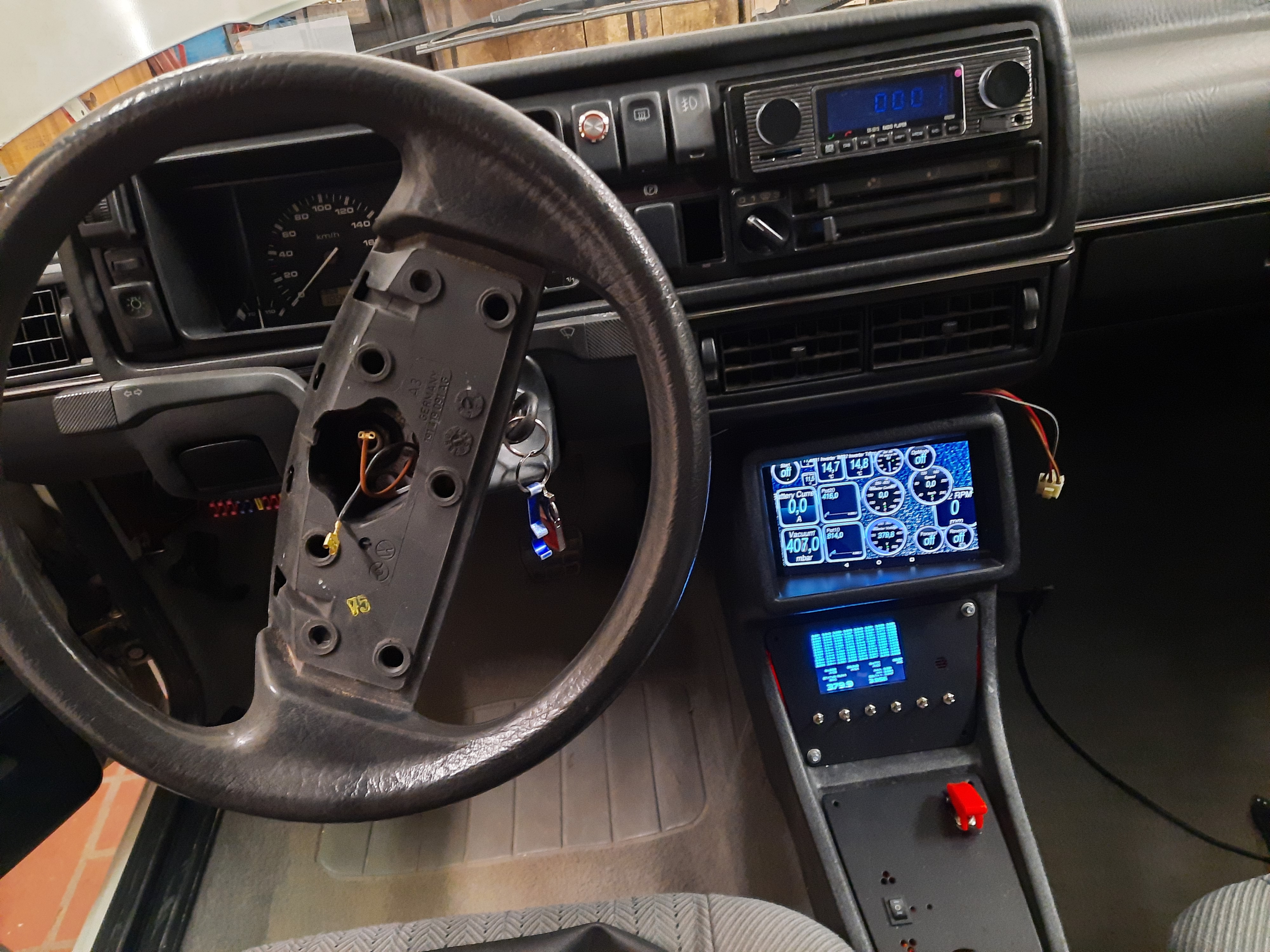 The dashboard got two new displays: The upper one is a Nexus 7 tablet running Timurs Kernel which enables features like autostart when starting the car. I am using an ESP32 with a CAN Module to disguise as one of those ELM327 OBD2 adapters. It listens to the CAN bus of the motor and the Nexus displays the data via the app Torque.
