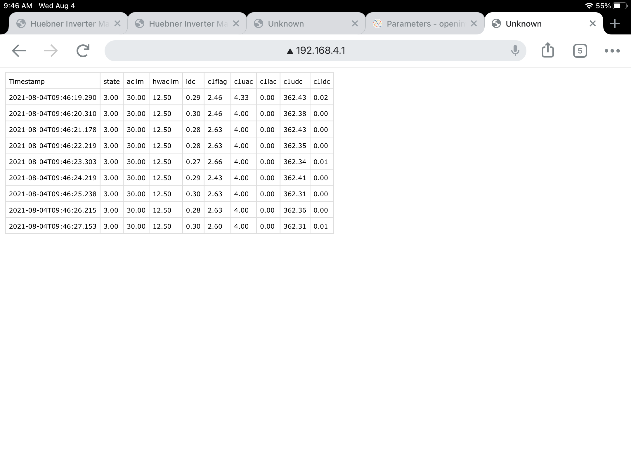 The only one which responds somewhat properly but not quite. When I set udcspnt and udclim slightly above current battery voltage (172V) and trigger charge then it looks like it wants to charge but quits immediately. I think this is because power module reports battery voltage as 232V !!! When I set charging limit to 240V then it seems like it initiates charging but current going into battery is only ~0.2A