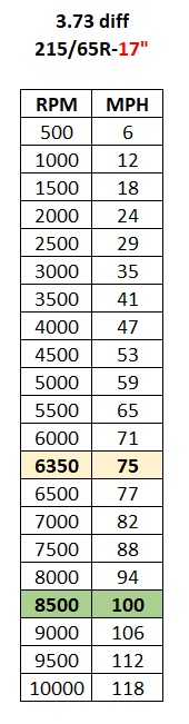 so I punched some numbers into the good ol' Lotus 1-2-3 (pronounced: Excel) ha ha to correlate RPMs to Miles Per Hour based on my 3.73 rear end and 215/65R-17 wheels