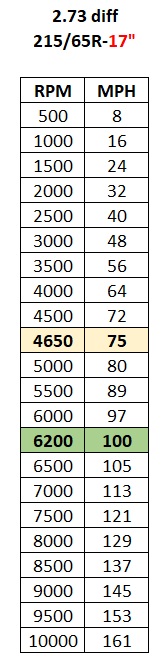 so I punched some numbers into the good ol' Lotus 1-2-3 (pronounced: Excel) ha ha to correlate RPMs to Miles Per Hour based on my 3.73 rear end and 215/65R-17 wheels