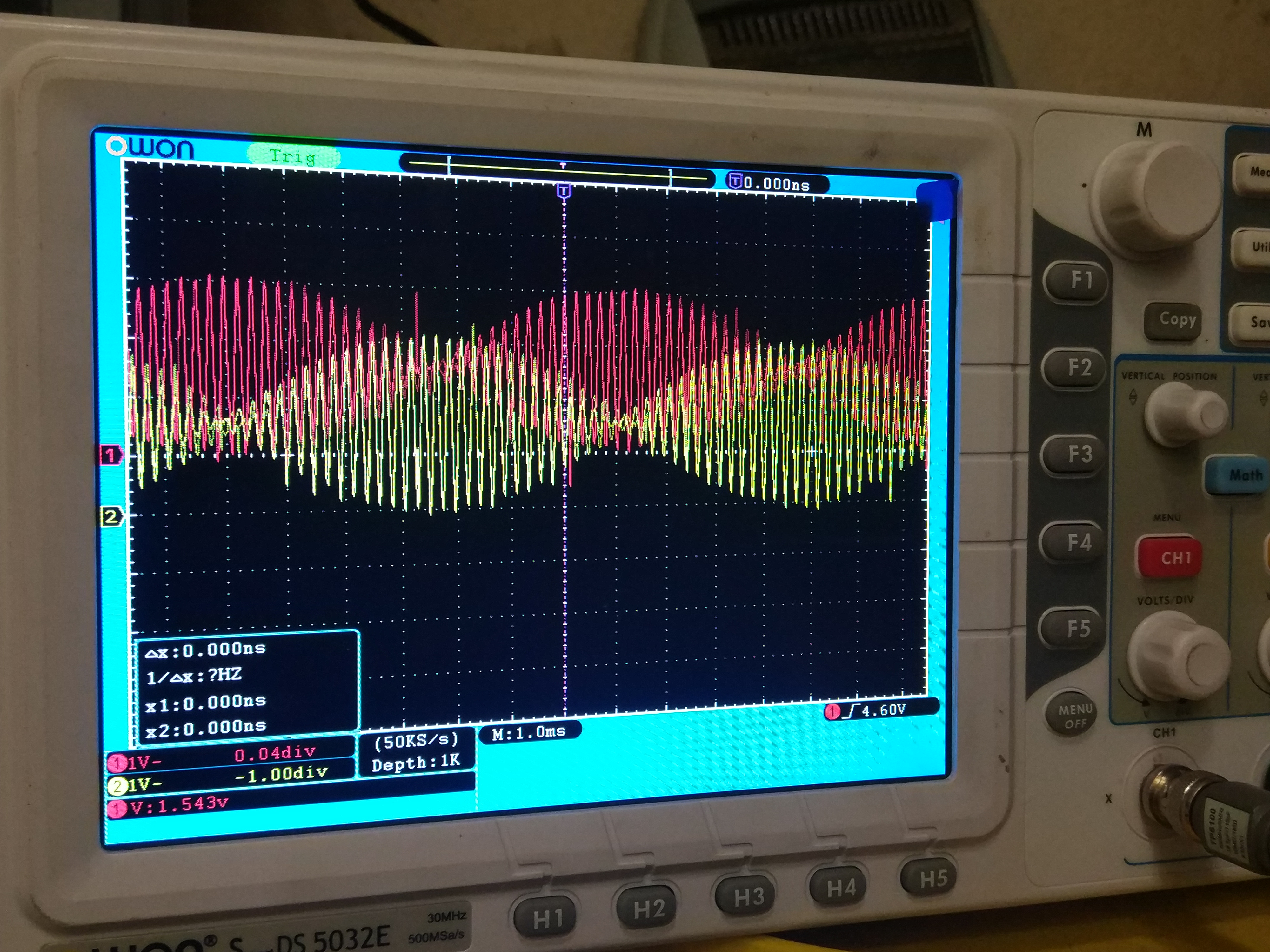 I connected the scope and rotated motor by ebike inverter. All this from 48V. I can see sine cos response but it's quite covered by hash. When I reach 200rpm a bulge forms on the scope. Is that good?