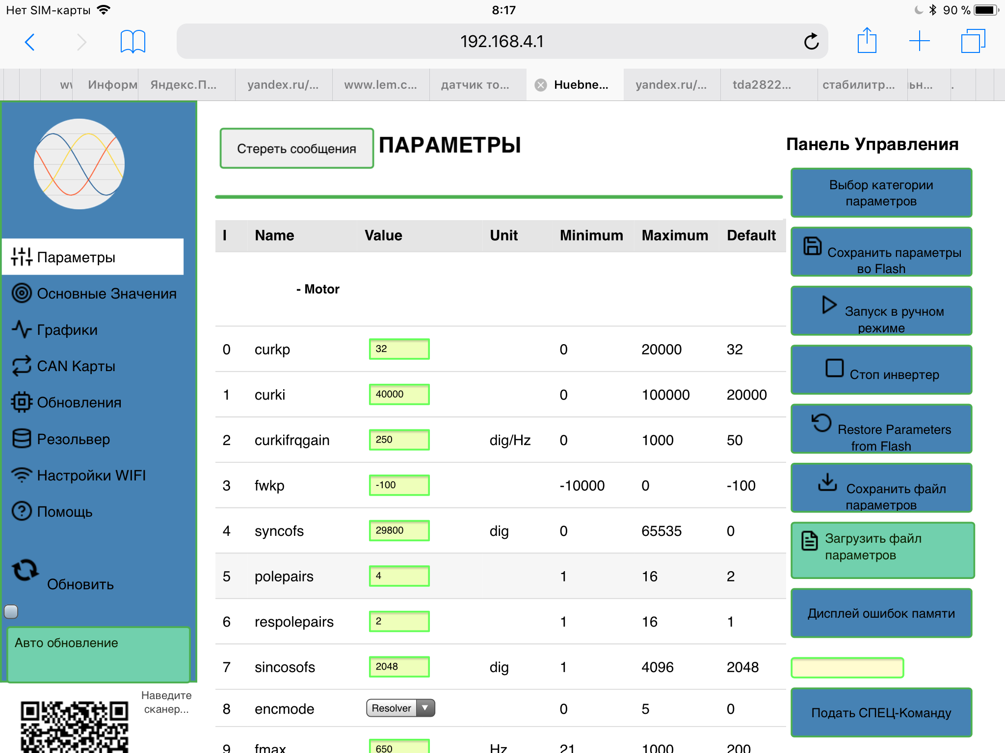 1. If save parameters during run, I get "parameters saved" popup, but parameters are not saved, as I remember it is not allowed. I stopped and changed some parameters, "saved" them and lost themlater I remembered to stop inverter before saving.