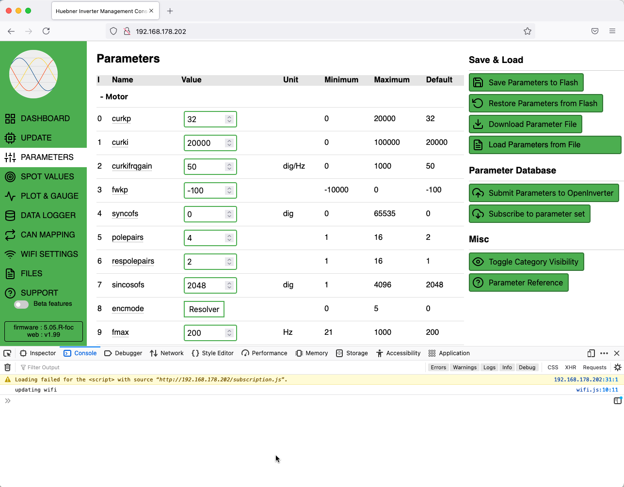 I did notice one other issue myself. When the inverter is in Run or ManualRun you can't save params. But a message to warn you about this shows up in the messages box, which you can't see when you're on the params page. This caught me out a couple of times because I forgot to stop the inverter before editing params. I'll add in some visual feedback/warning for this.