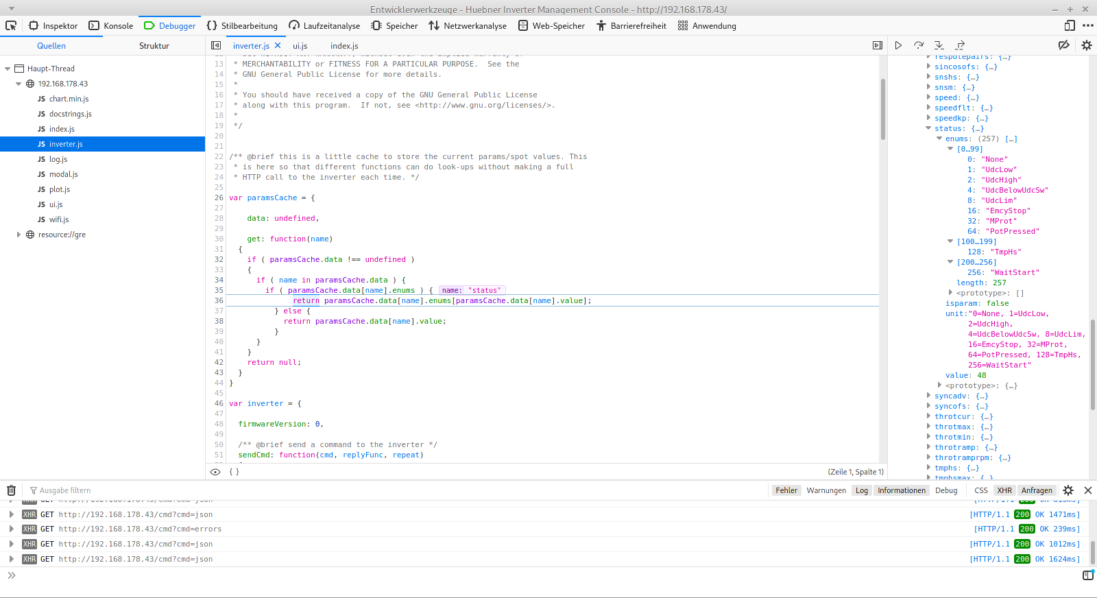1. Screenshot attached. It checks for status which in my case is 48 (two flags set). It doesn't handle flag channels so return undefined. Check Spot values implementation on handling (multiple) flags. While debugging I also noticed it calls cmd=json twice.