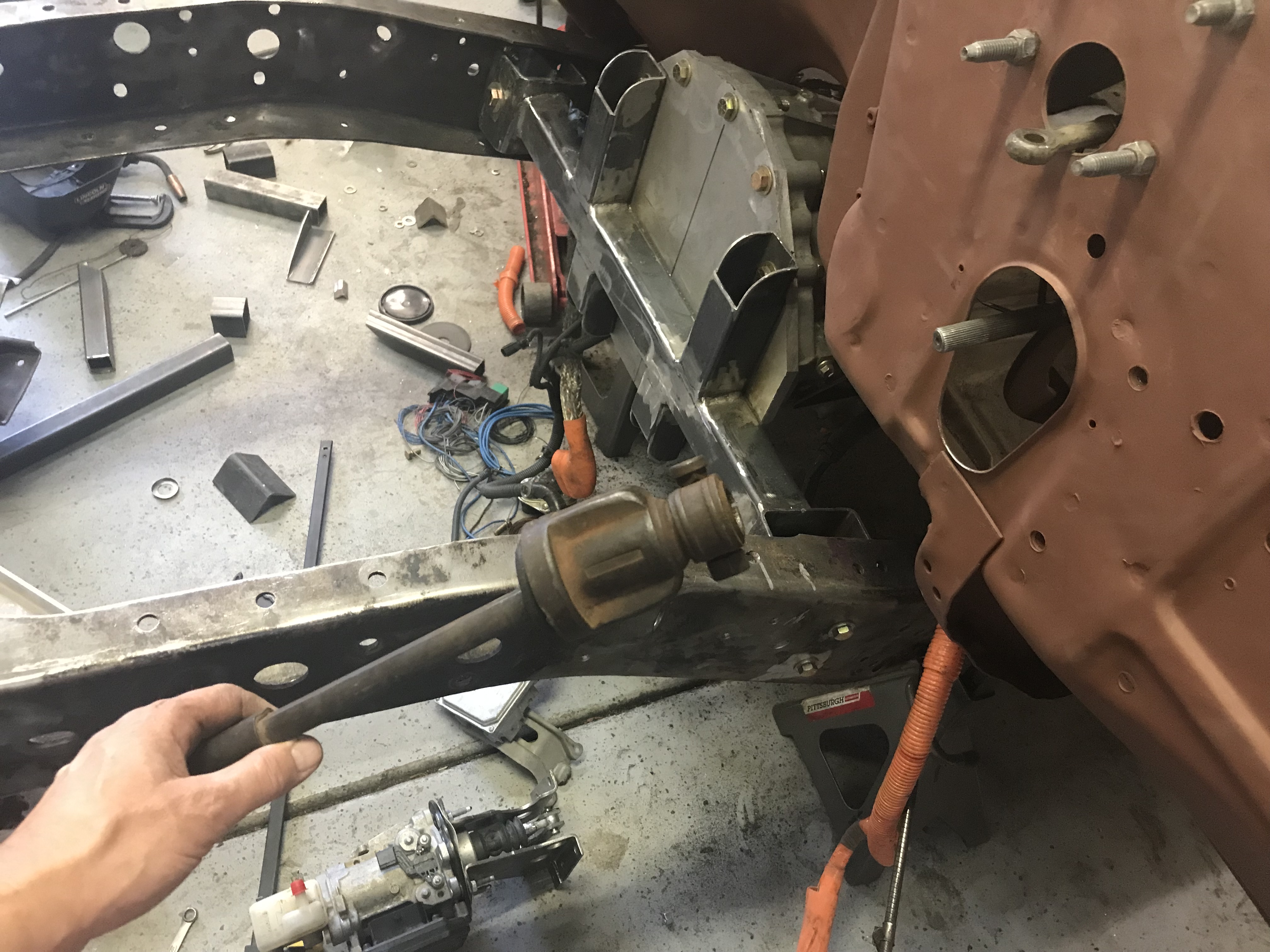 the long "intermediate" steering shaft that runs from the rag joint on up to the steering column inside the firewall is really made up of two pieces, designed to slide inside each other incase of a head on collision allowing the driver to be decapitated by the hood (ahem bonnet) instead, so I am keeping that rod and will just have to extend it 6 inches, or I may replace the Prius "intermediate" shaft with one from her sister car a Corolla