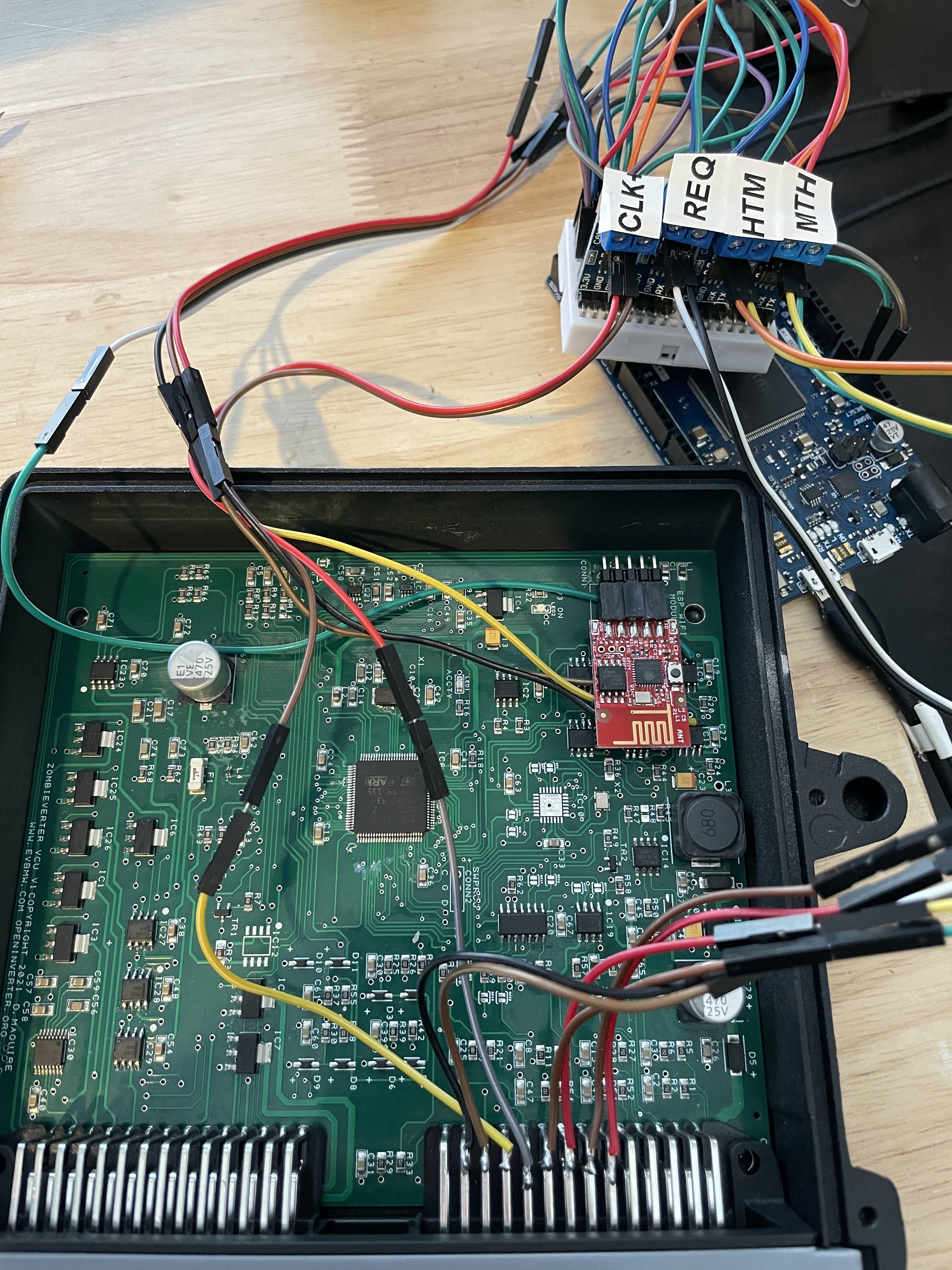I then measured at the white arrows and didn't get any CLK+ and CLK- signal: Then I used external can transceiver modules between the input pin 1 and the 56pin connector: The syncserial then gets to the inverter and I get data back on the MTH cables.