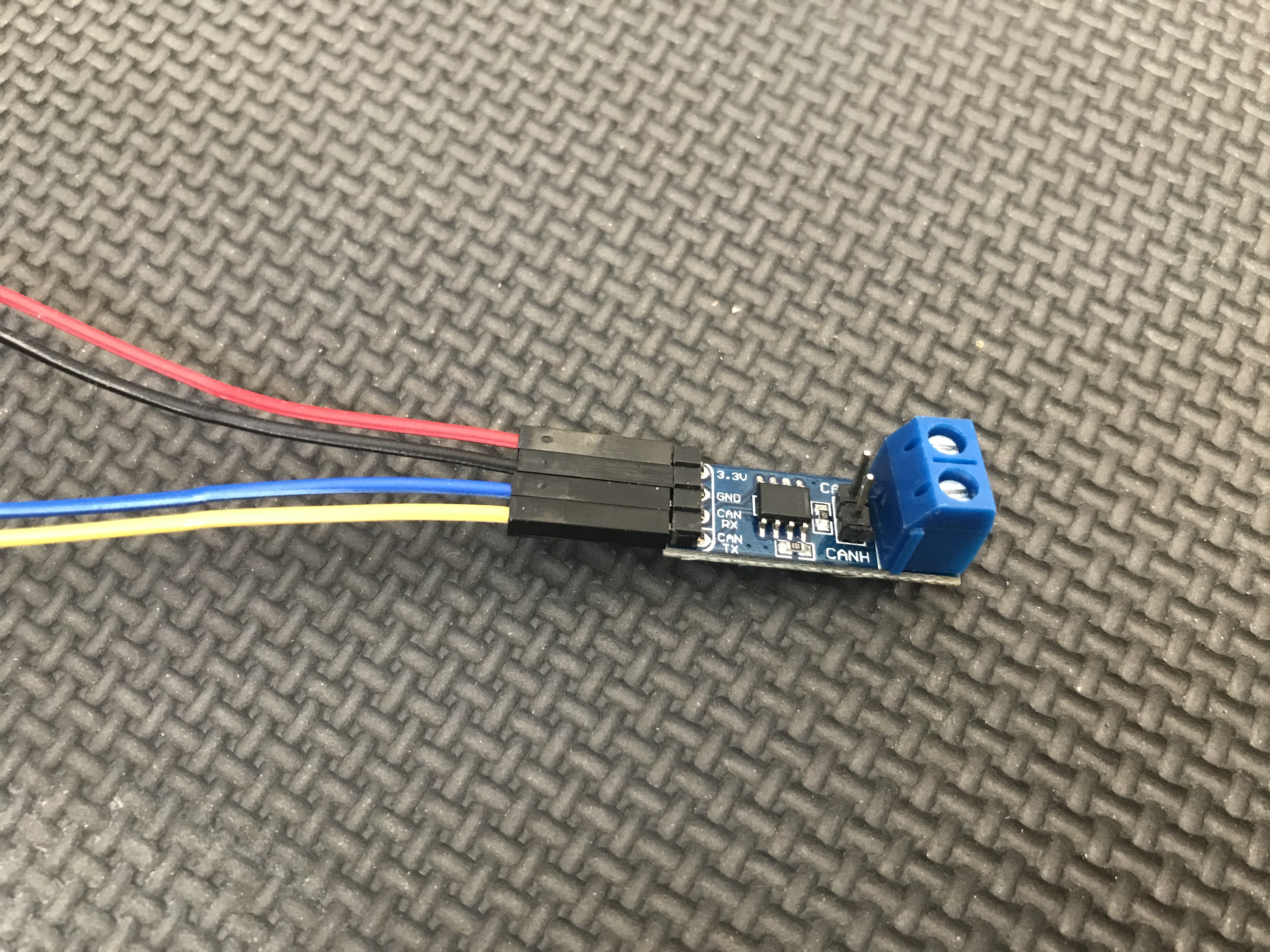 the little CAN Bus transceiver is connected to the Arduino Due board (aka the brain ie microcontroller) via four wires, it get's it's 3.3 volt power from the Due board in daisy chain fashion