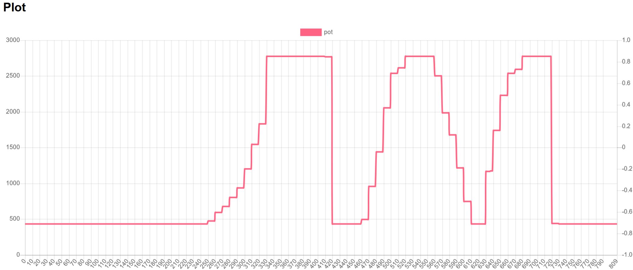 One more question. I did a plot of Pot, Pot1, Potnom while pressing the accelerator pedal and all look to behave as expected. I then did a plot of torque and got the graph below...not as expected. Wondering if anyone has a thought on this, it should be similar to potnom no? This plot is showing the pedal move from off to full and back to off just once, so I expected it to rise from 0 to max and back to 0 only. Looks to skip to negative values half way through pedal travel