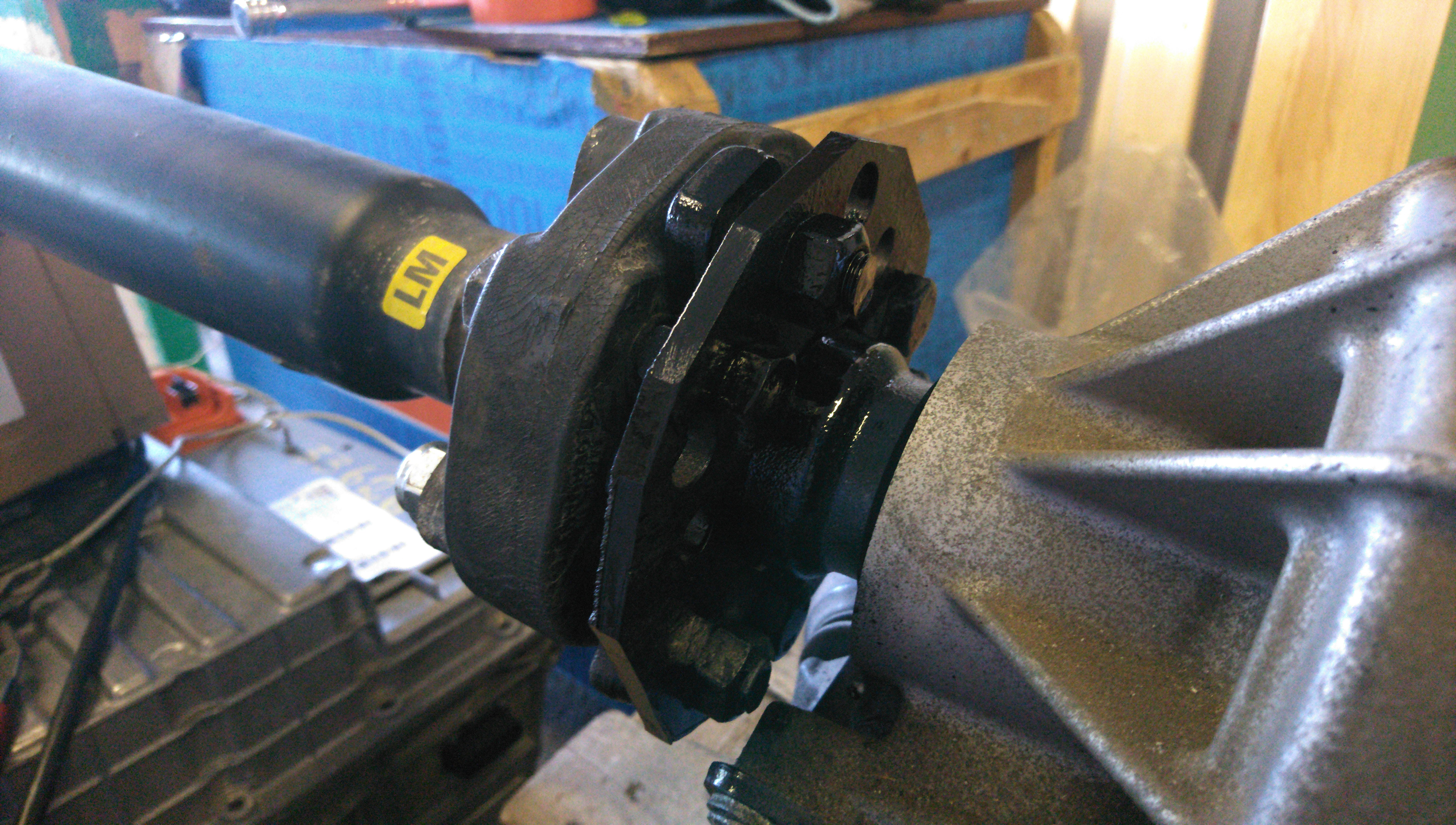 Also, the transmission input shaft is now locked. I should calculate whether that is sturdy enough but for now I'm happy with "maybe". That aluminium angle is 5mm thick and those are M12 bolts, two to the bell housing, two to the torque limiting disc. The ones going to the disc are spaced appropriately using drilled out nuts and all are torqued very tight.