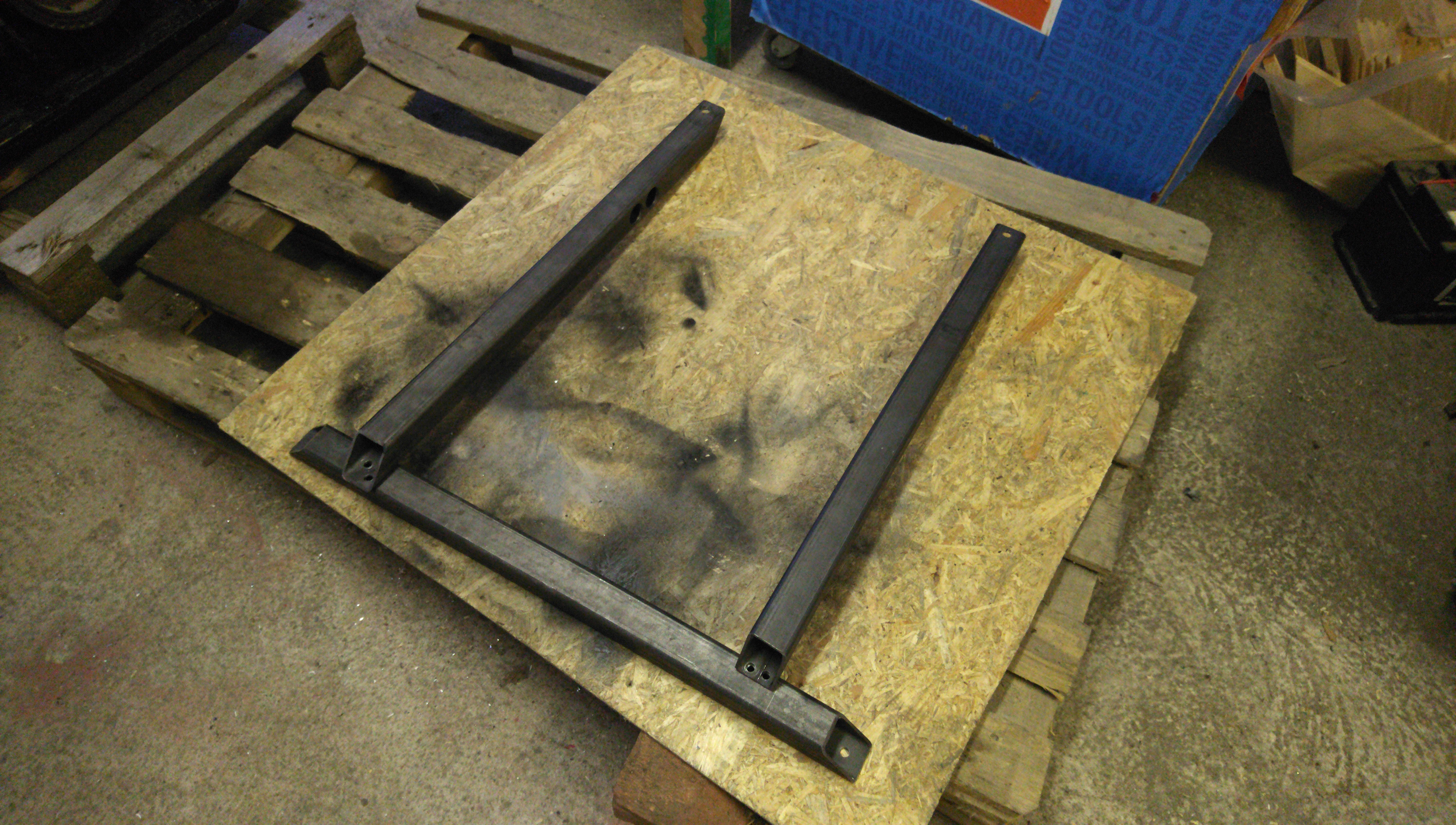 I decided to make this weird sub-subframe. Brackets will be welded to it to carry and mount the battery box... once I have a battery box. Also, this way it's very easy to mount flat or small components underneath the battery box. It could be the space for the liquid cooling and heating system.
