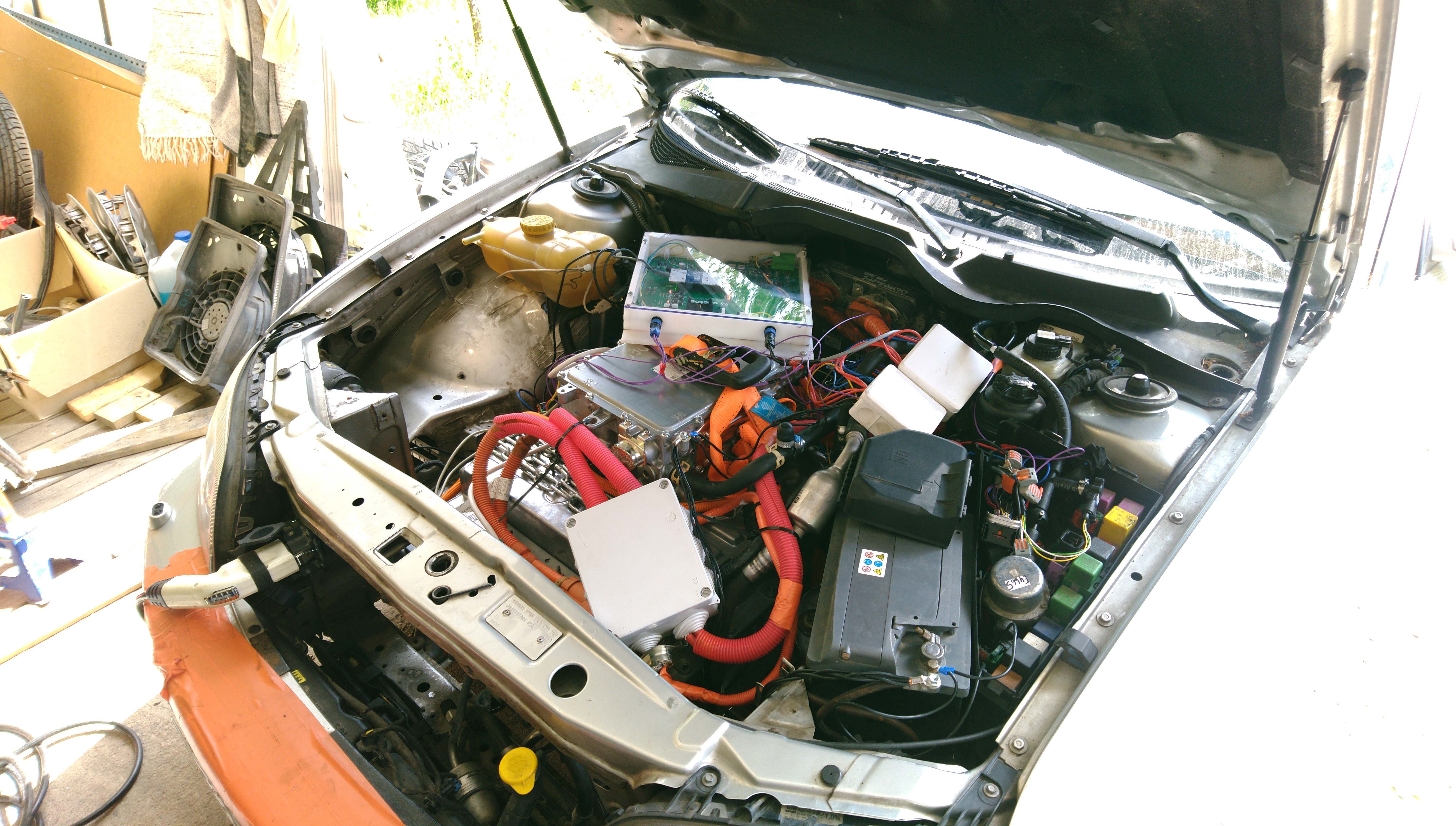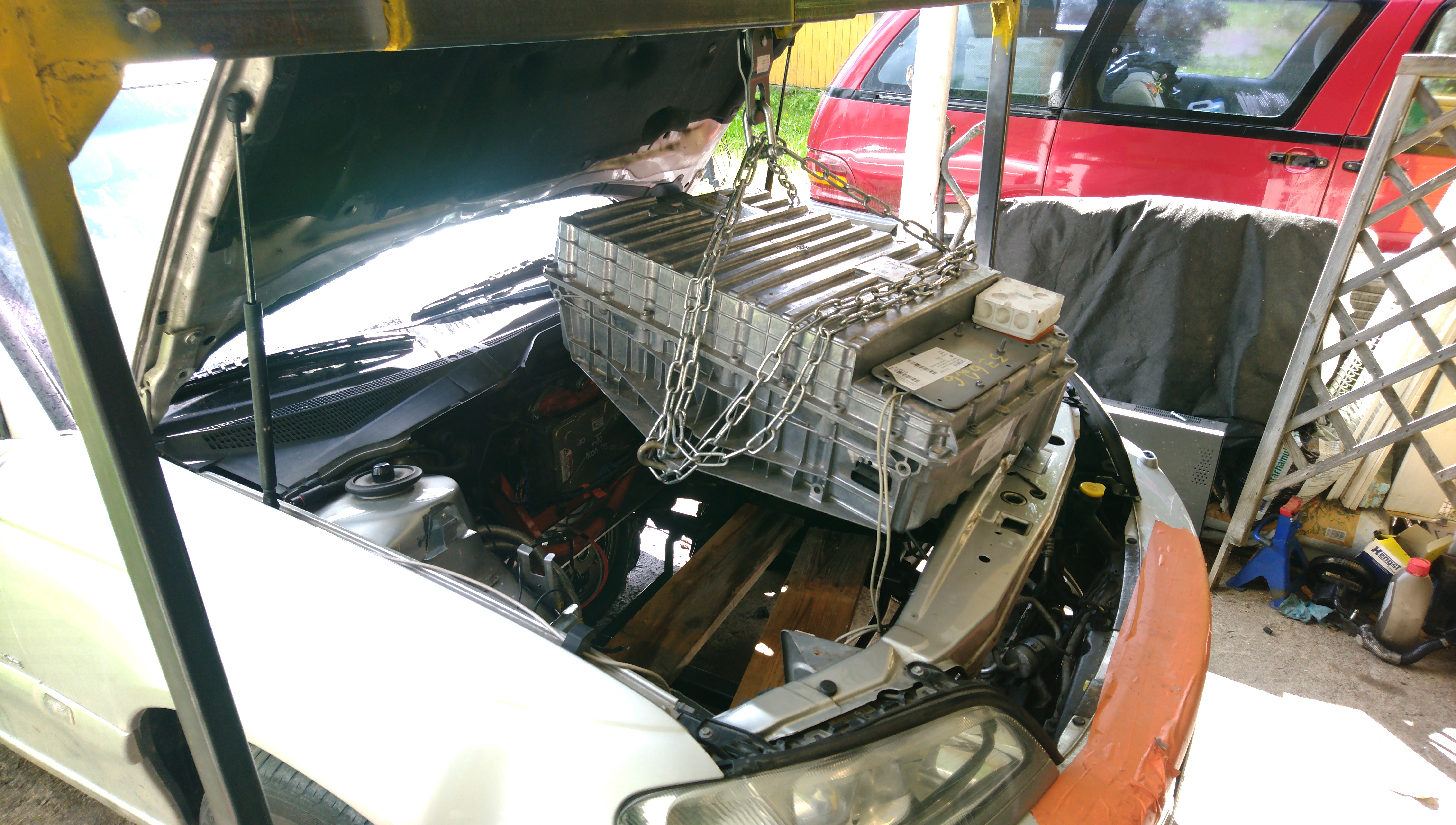 Then I craned in the good old BMW X5 battery for some testing. Remember to tie down your HV components using orange straps. Otherwise they'll fall off.