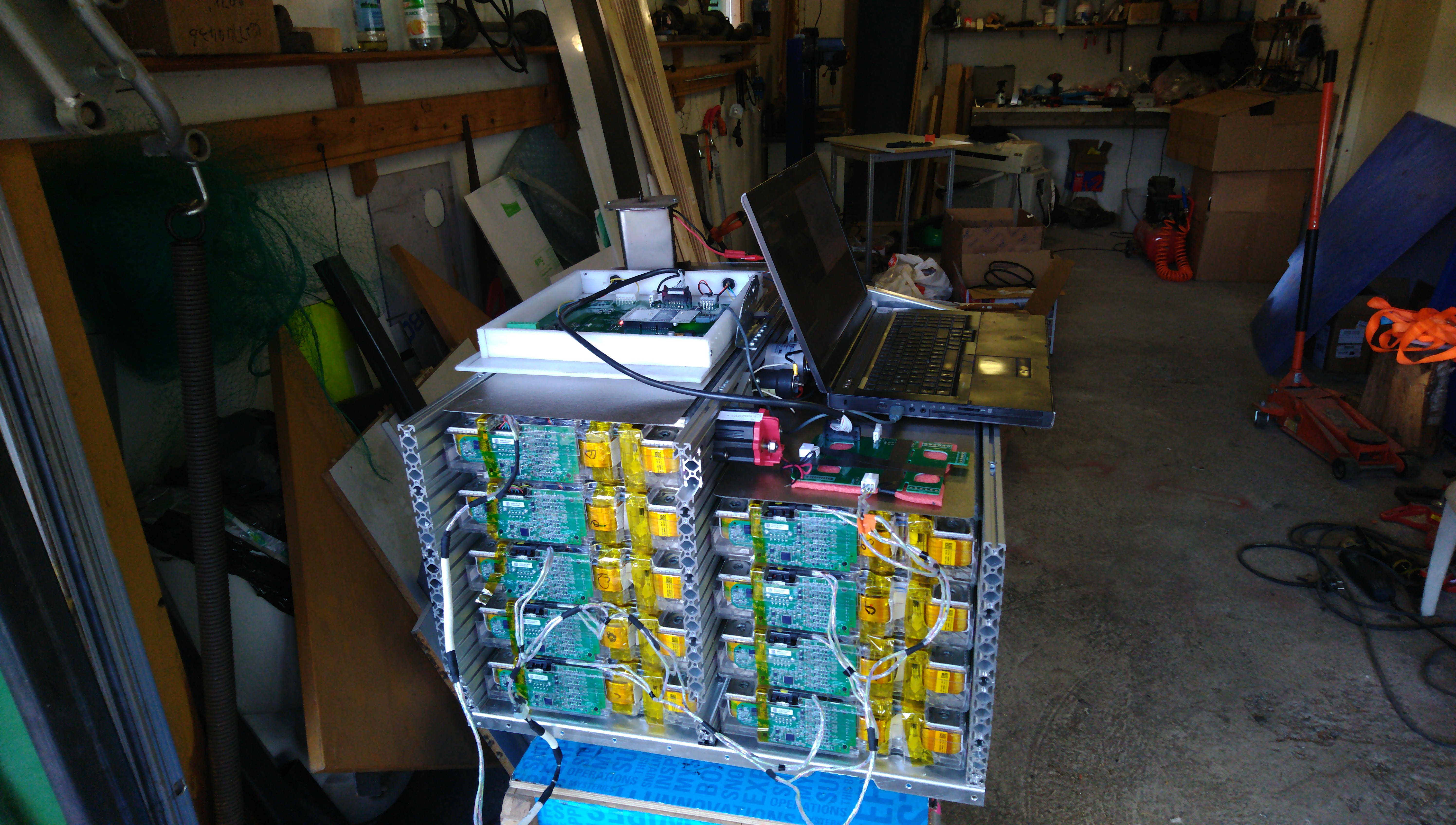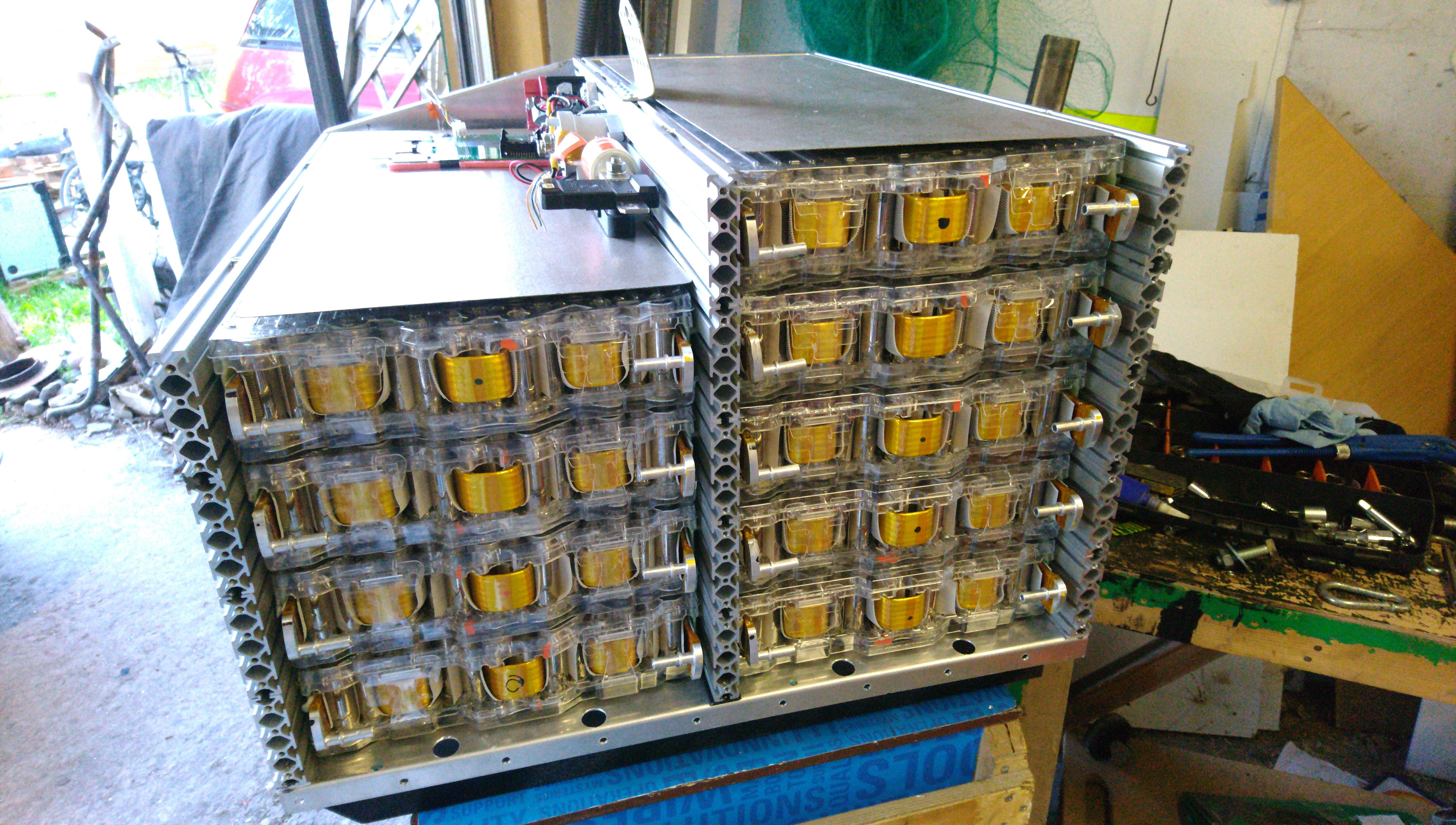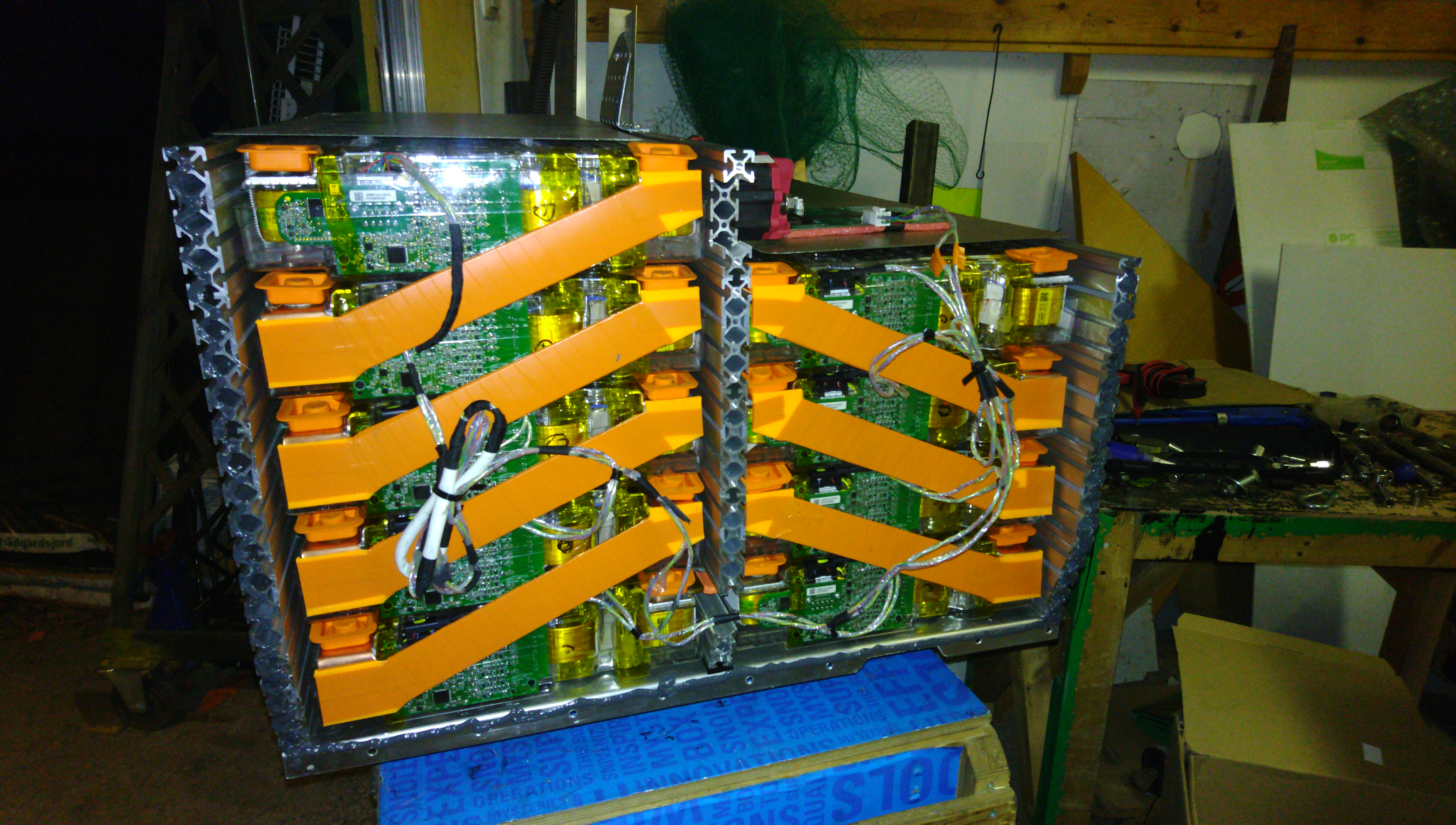 Turn the box around, and we have the scary side. Installing the module interconnects in this box is NOT enjoyable at all. There's very conductive very sharp alu profile very close to everything, the terminals are stacked on top of each other, the plumbing on the other end of the modules prevents pulling the modules forward much at all. Basically you just try to maintain focus and hope you'll die some other day for some other reason. And add lots of electrical tape on your spanner. And work with only one hand wherever possible.