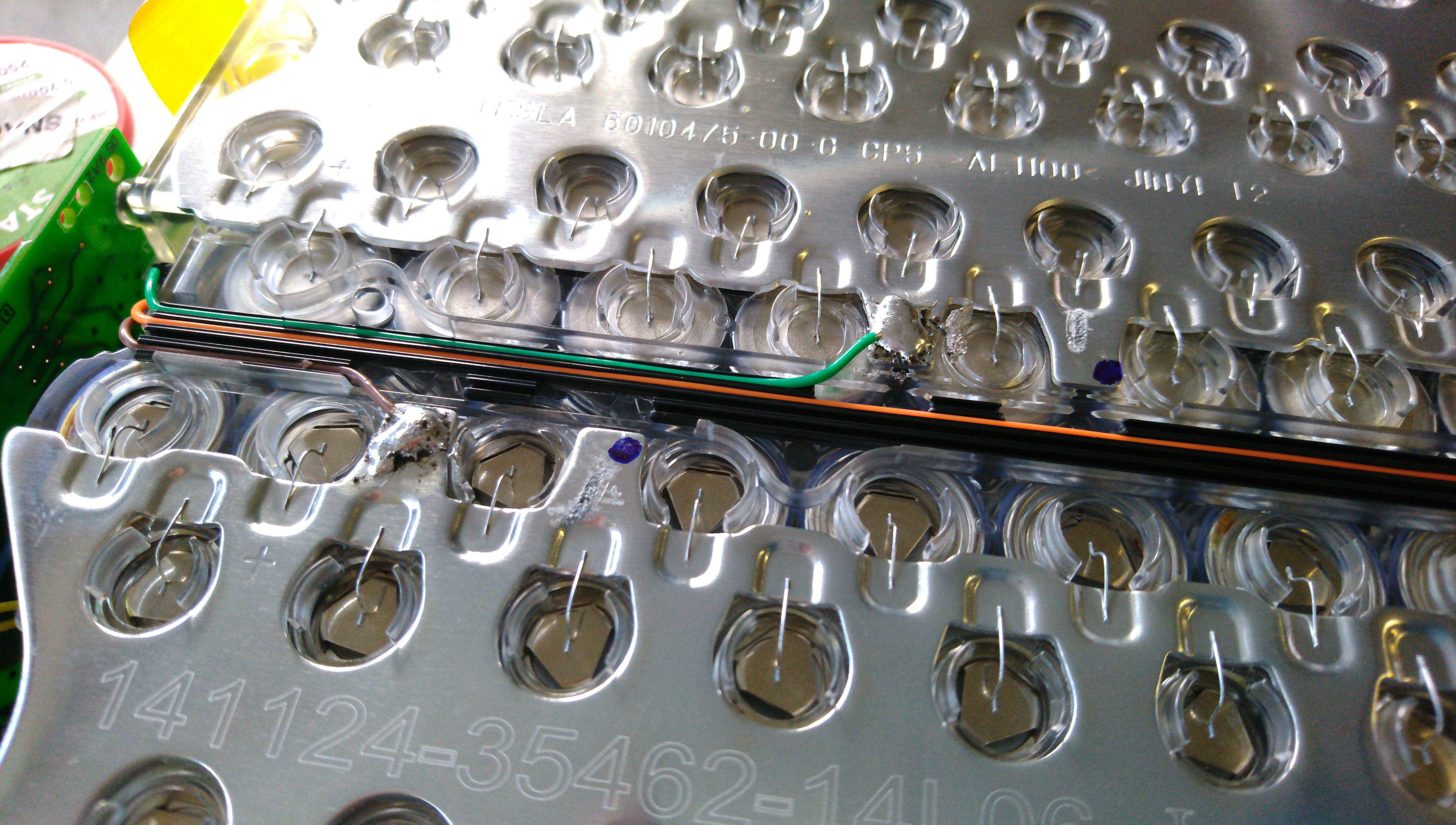 Then I quickly modified the original Tesla harness into something I can use and wired up the BMS to see if everything worked. Had to modify the code a bit to get it going. Then noticed one of the modules looked like it had a broken sense wire, inspected it, and found two detached wires on the bottom (as they always are).