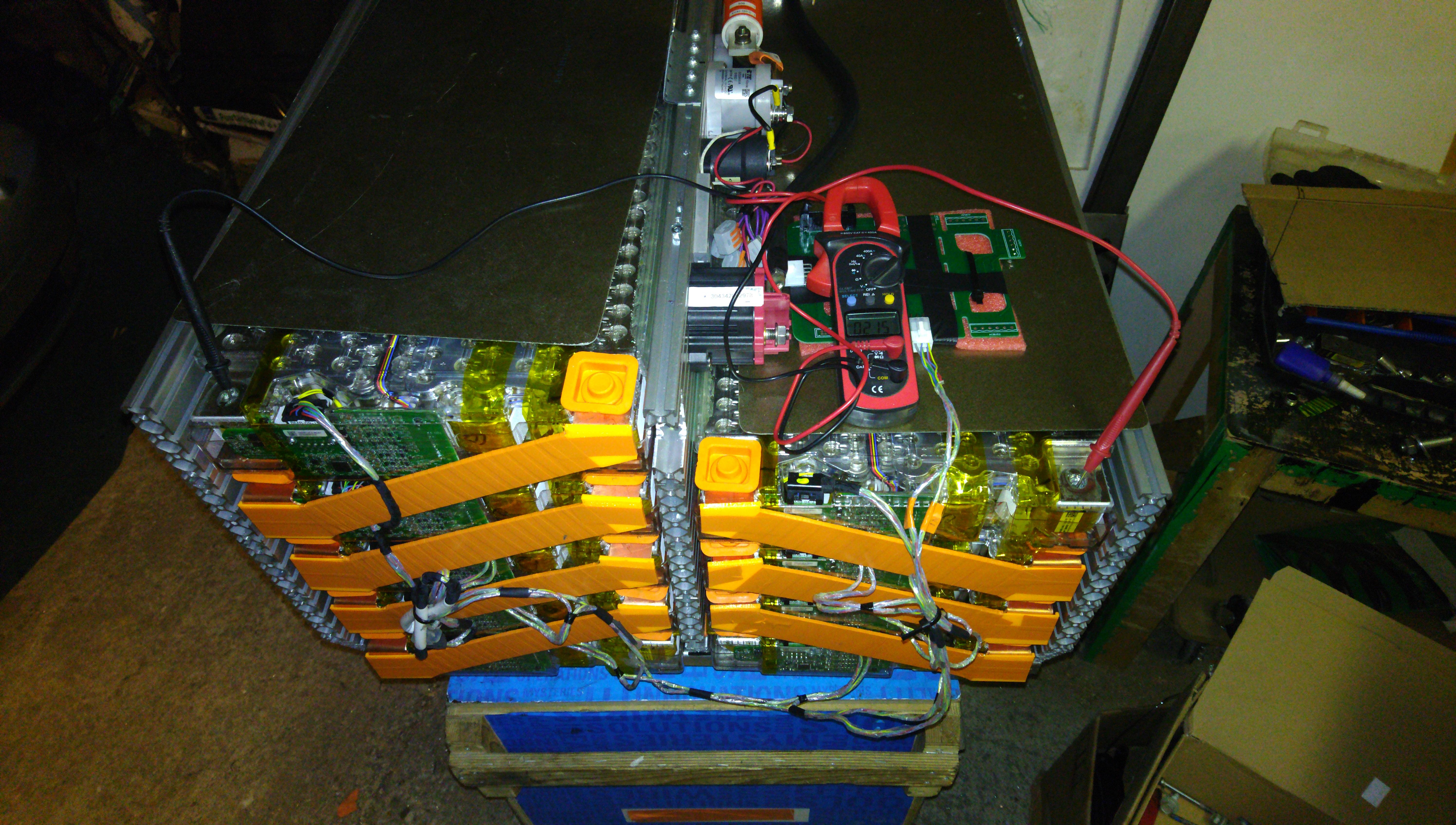3D printed spacers to block the modules from sliding on the rails are also visible, and some adhesive sealant. The side plate is going on, with HV connectors. Those are Amphenol's cheapest 350A offering at the time of browsing Mouser, or something like that. I even managed to get them keyed, but didn't manage to find matching colors. Also, no HVIL. Might 3D print something later.