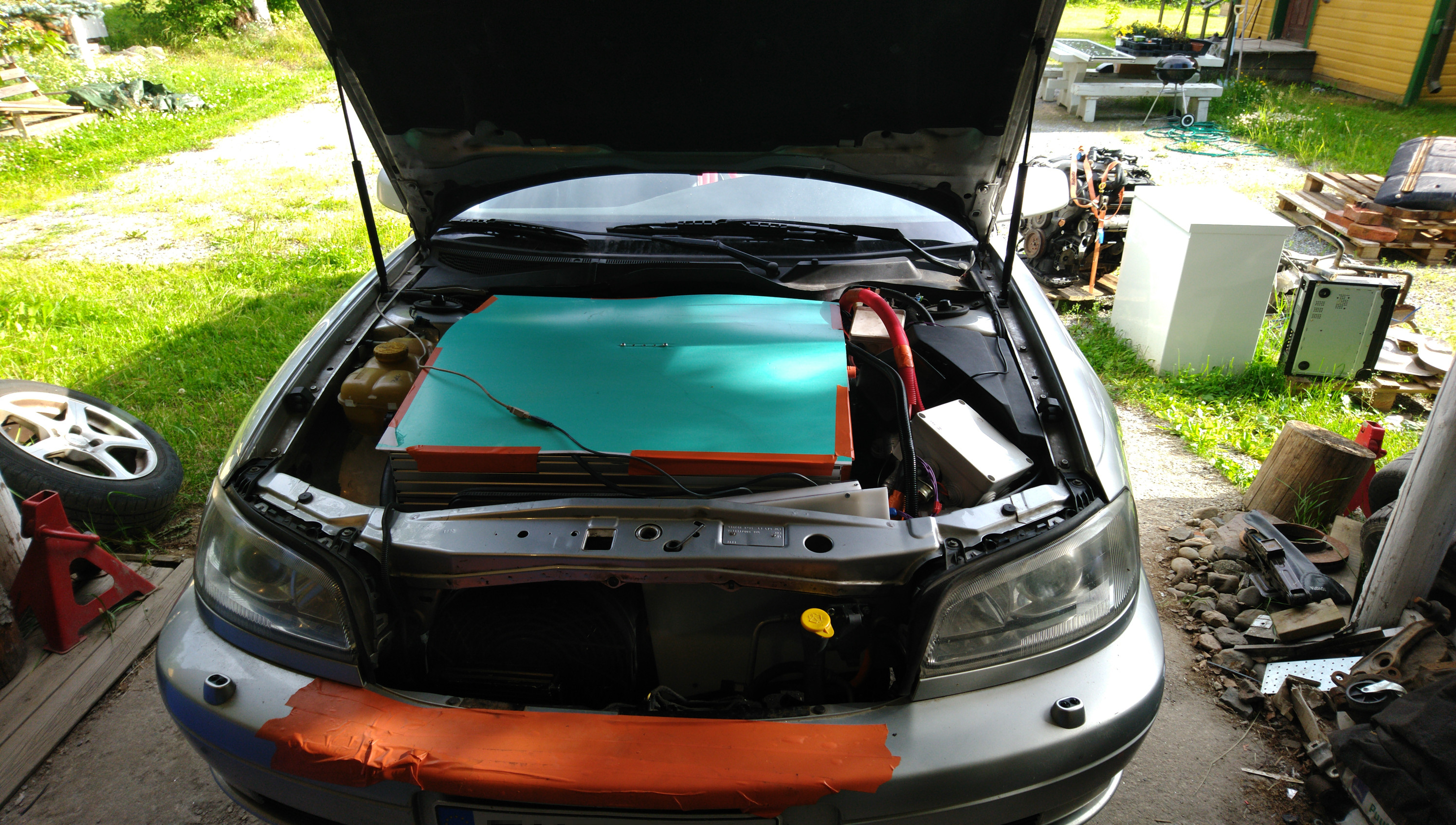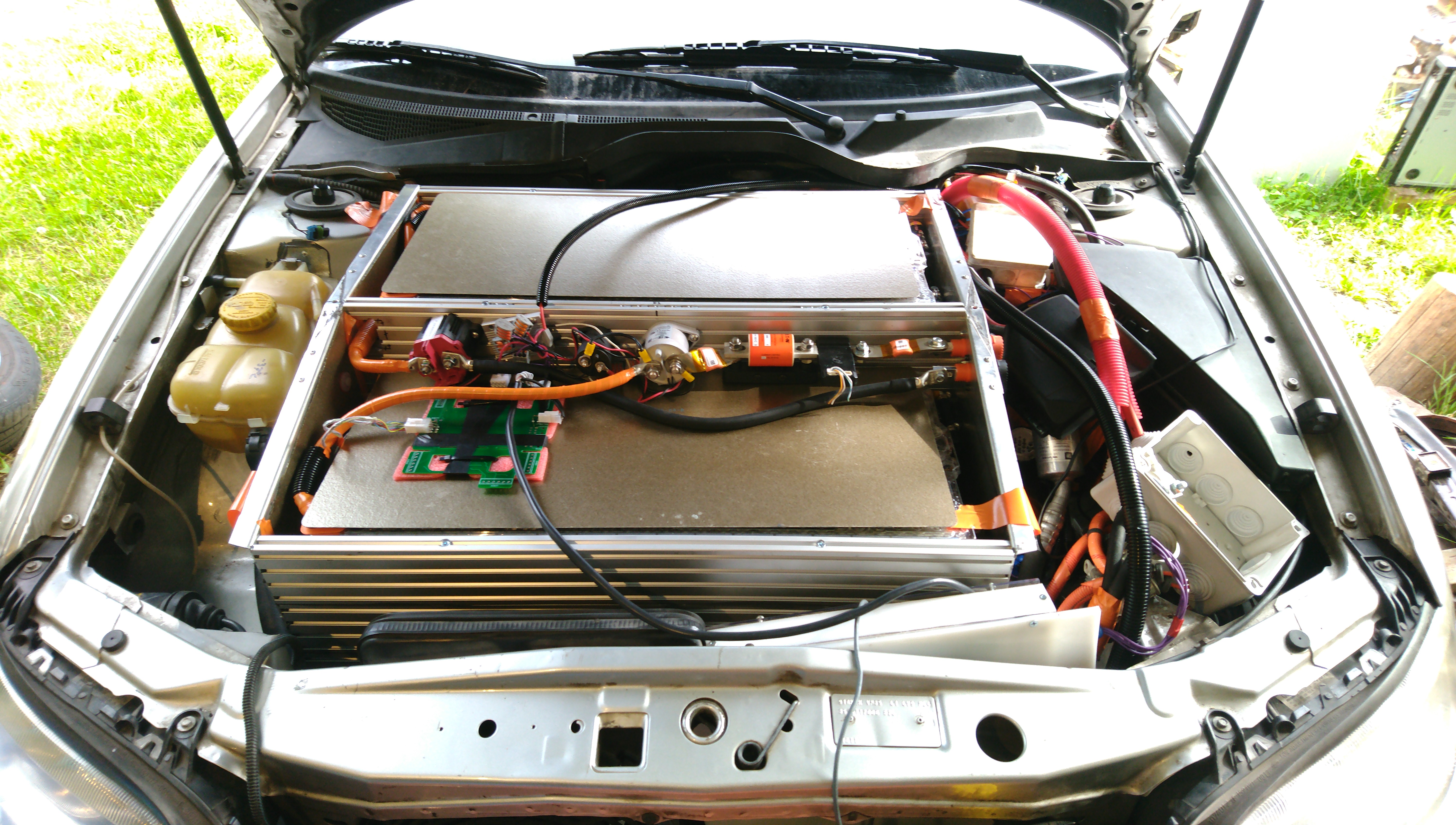 Weighed the car. With me inside (60kg), it's 1100kg front, 860kg rear. The maximum allowed front axle mass is 1080kg. I think I went too far with the front pack. Might have to move one or two more modules to the rear to get this inspected. Without passengers the front mass is 1070kg, so I could try my luck I guess.