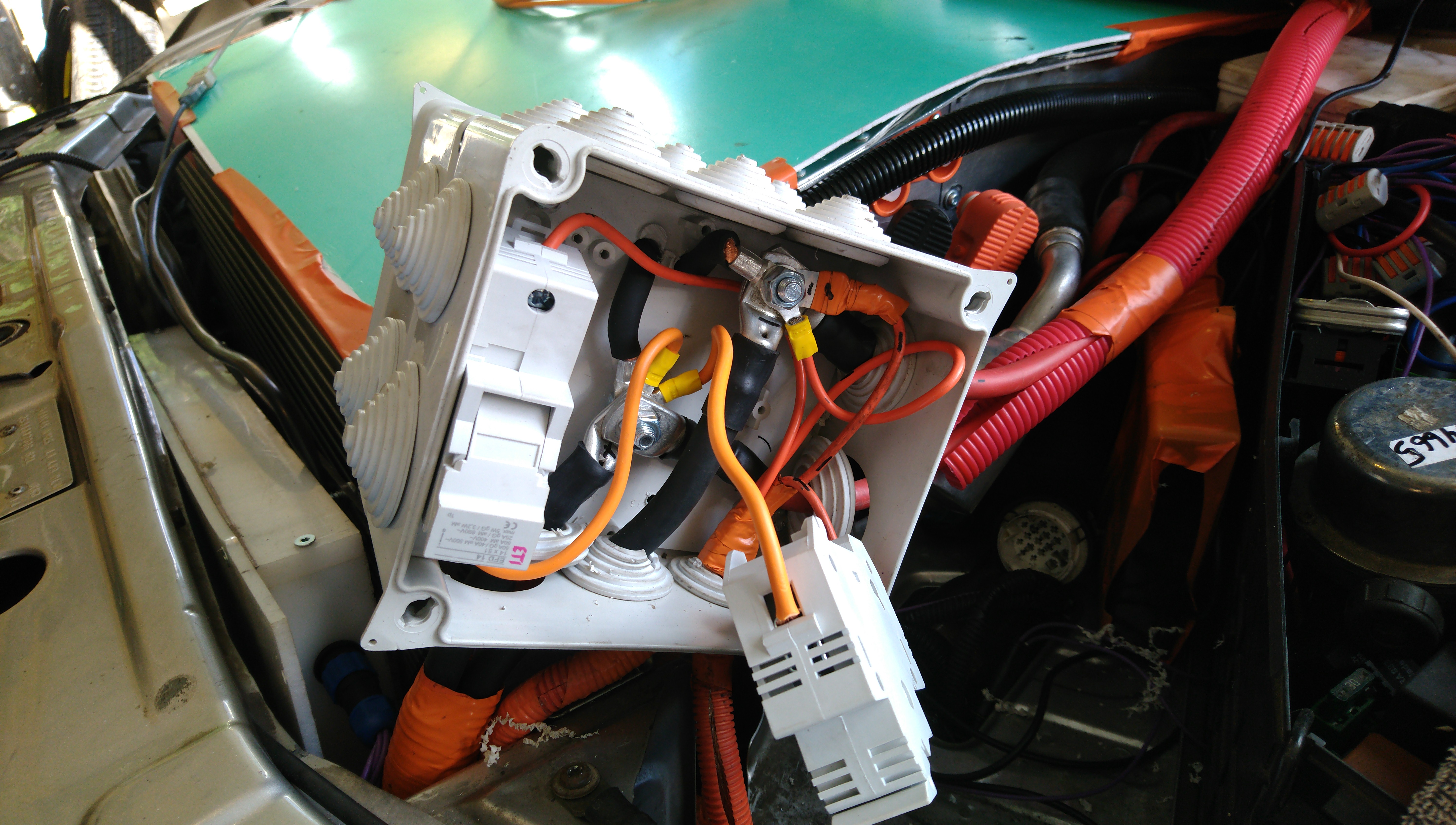Installed HV stuff in the small space on top of the front battery box. The expensive alu profiles show an added benefit here, as I happened to have some of the appropriate cage nuts to go with them. How many? Only 1 left now. I'm that efficient. Also crimped two internal 50mm2 wires but didn't install yet.