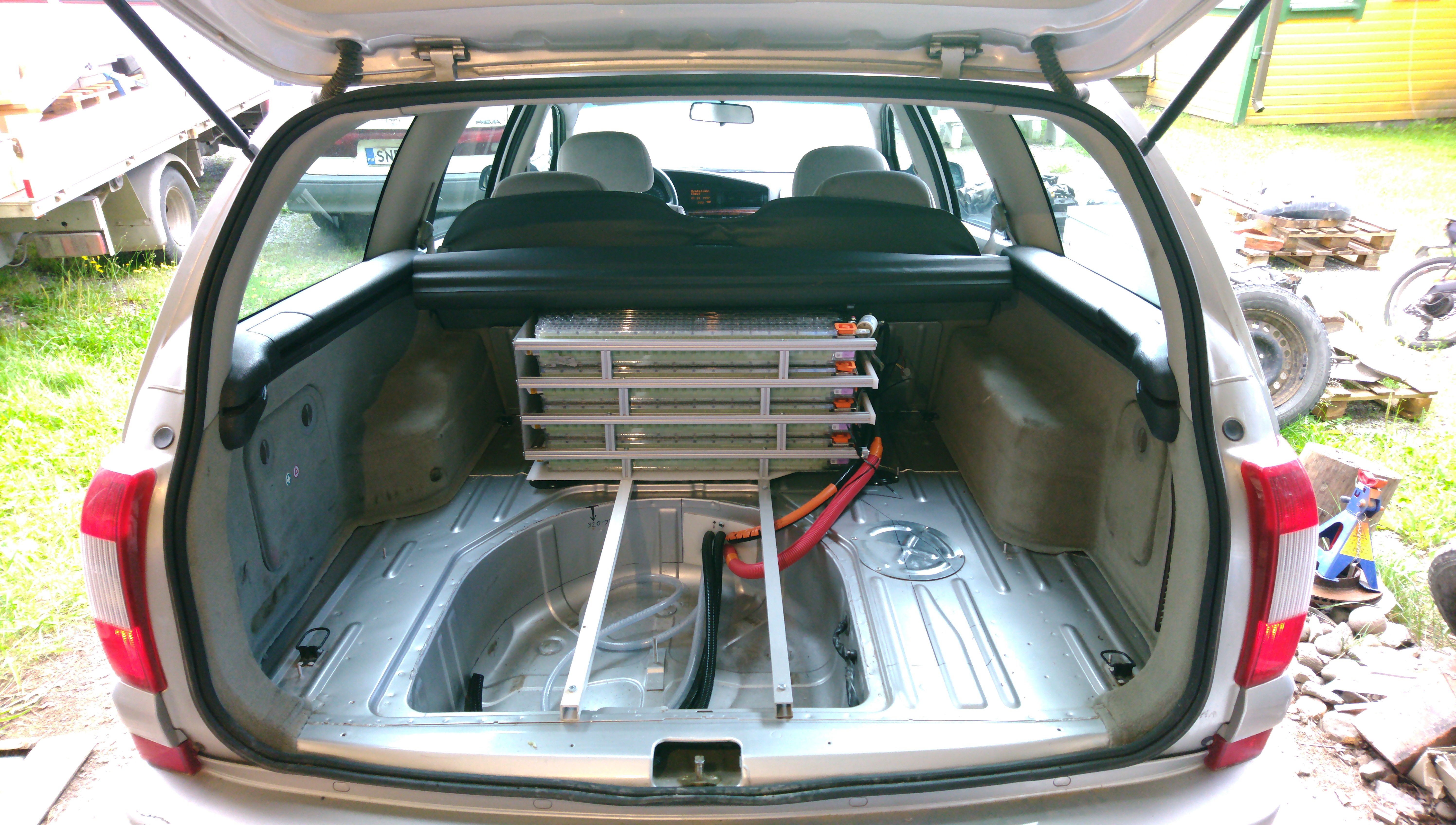 Hung a big bunch of cables and hoses to the bottom (what an absolute pain) and continued building a temporary rear battery pack. Later, the spare wheel well will be extended and this same pack will be lowered into it. Also, meanwhile working on the signal harnesses.