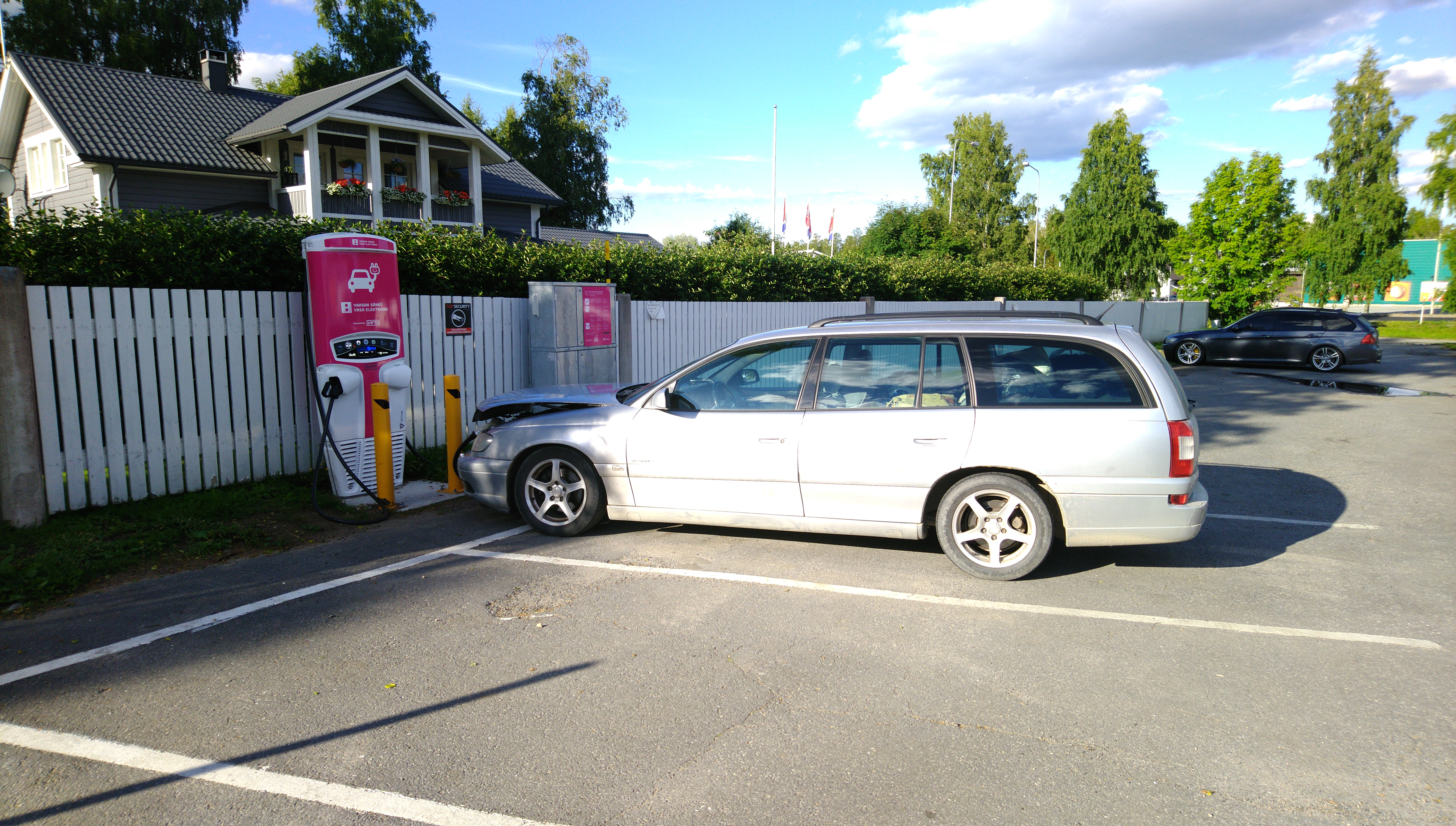 Here's a happy photo of the last charging stop on the trip. That's an ABB charger. Those things always work. In the background is a row of Kempower CCS units. The ABB charger has probably been raised up like that because of snow in the winter.