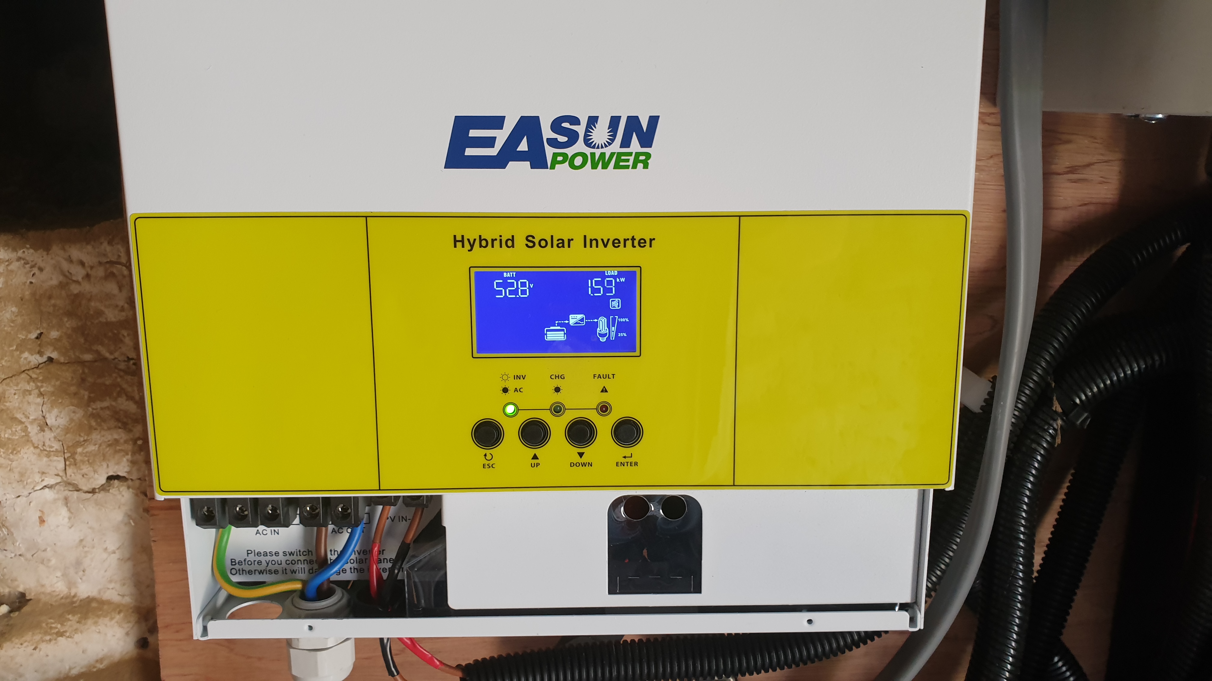 Time for a little update. The victron decided to blow one mosfet leg about a week ago. Ordered replacements from Ali. In the meantime I got lucky and picked up this "Easun" 5.5kw hybrid inverter second hand locally. Literally just threw some panels down in the field and have been running off grid since. Charged the goose today totally from solar as there was nowhere else for the energy to go as the house battery was full