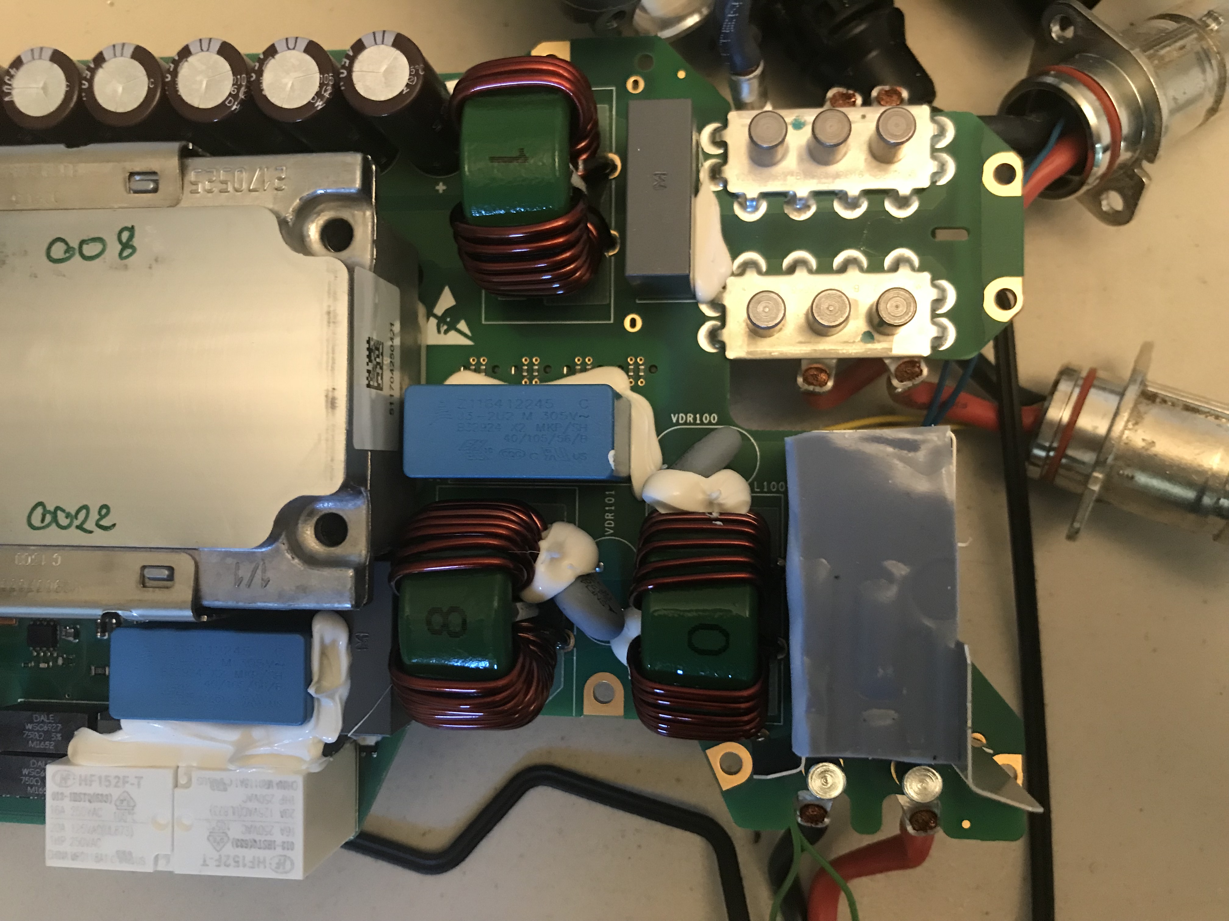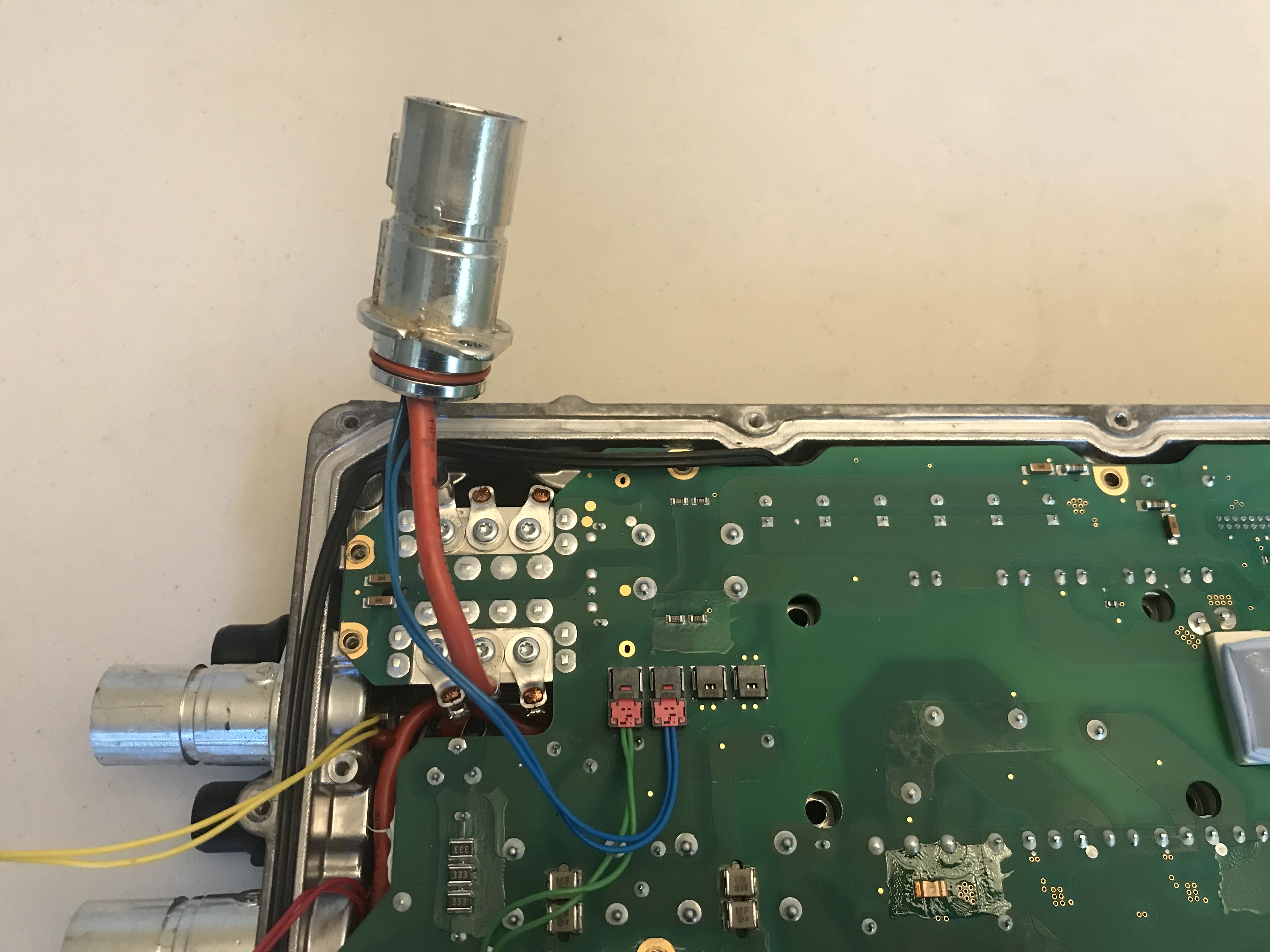 I just had to know where those tubular connectors run to, so I think this first one is actually the AC input plug that runs to the charging port socket, I rerouted it for demonstration purposes, at least in the end it's just a ring terminal connection, so that can easily be replaced with a regular high voltage orange cable, but what are those green thin wires for?