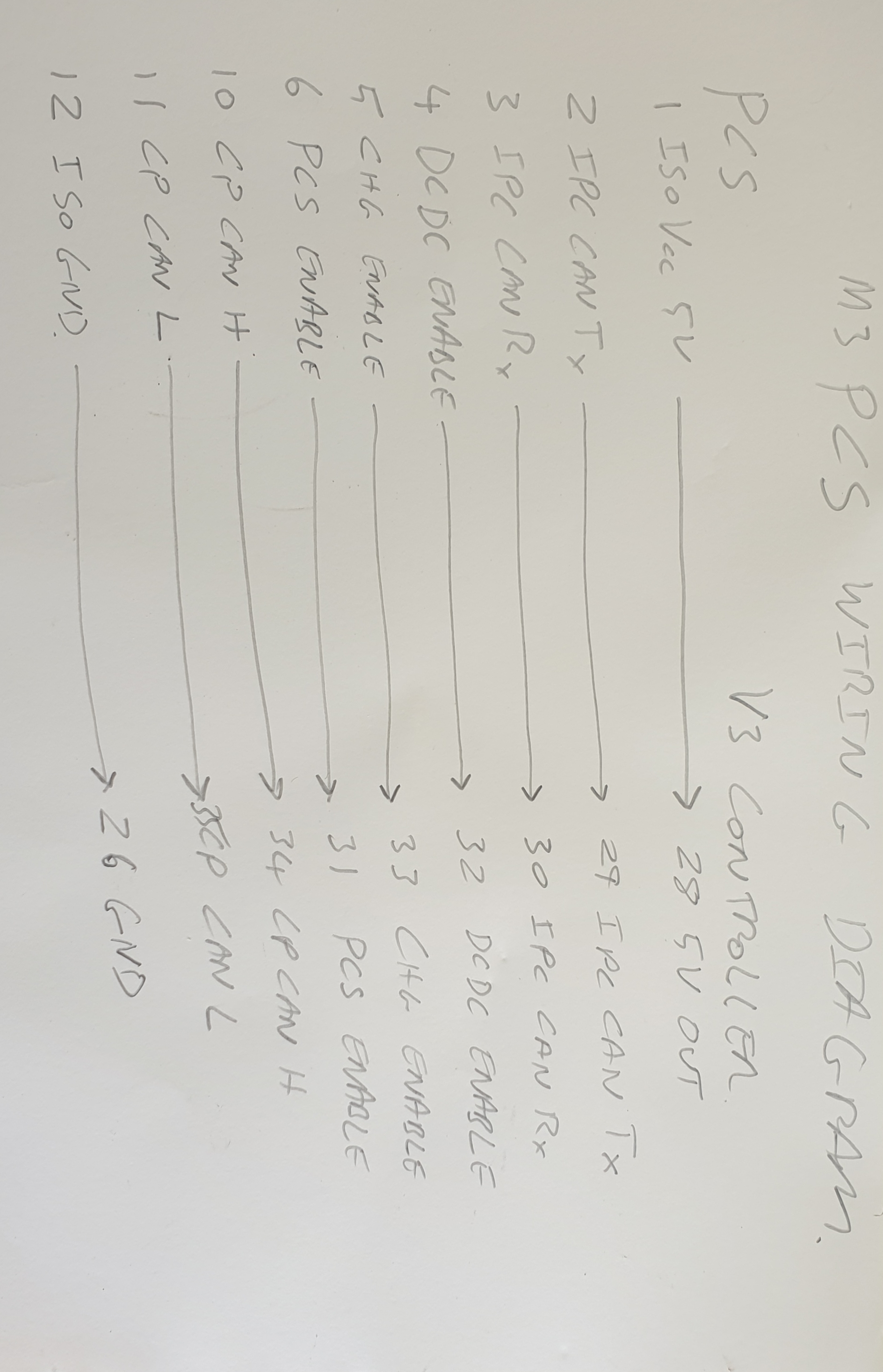 Given past experiences with Tesla chargers I would not try using the PCS with anything under 200v (250v to be safe) but I could be wrong. Finally got around to building up a controller and connecting up to my first non working PCS. Noticed the wiki page is very sparse so a few diagrams on there would help for sure. I drew out a rough diagram showing the pin assignments from the PCS data connector to the V3 controller. Perhaps someone more artistically inclined than myself could make it look nice. First order of business is a log from IPC can with just 12v connected to the pcs. No need for HV DC or AC at this point as there is no point trying to enable the unit if it is reporting faults due to CAN in the error matrix previously discussed. To that end CONN2 on the controller provides access to IPC CAN and the white and black wires in the picture can be seen connected to a logger running SavvyCAN. If anyone genuinely wants to help with the process then a log from IPC CAN under the circumstances described along with as much info about your particular PCS would be ideal.