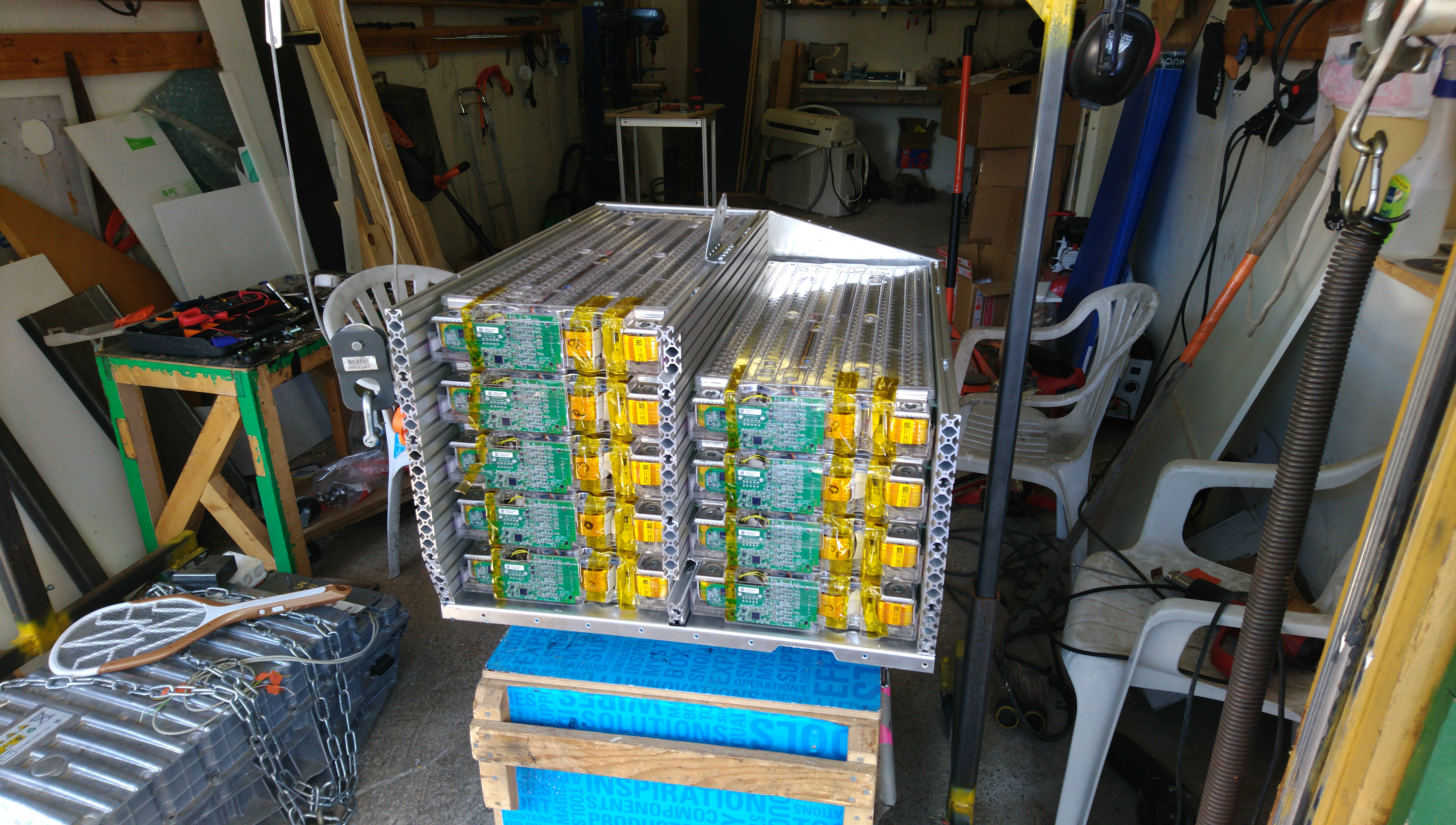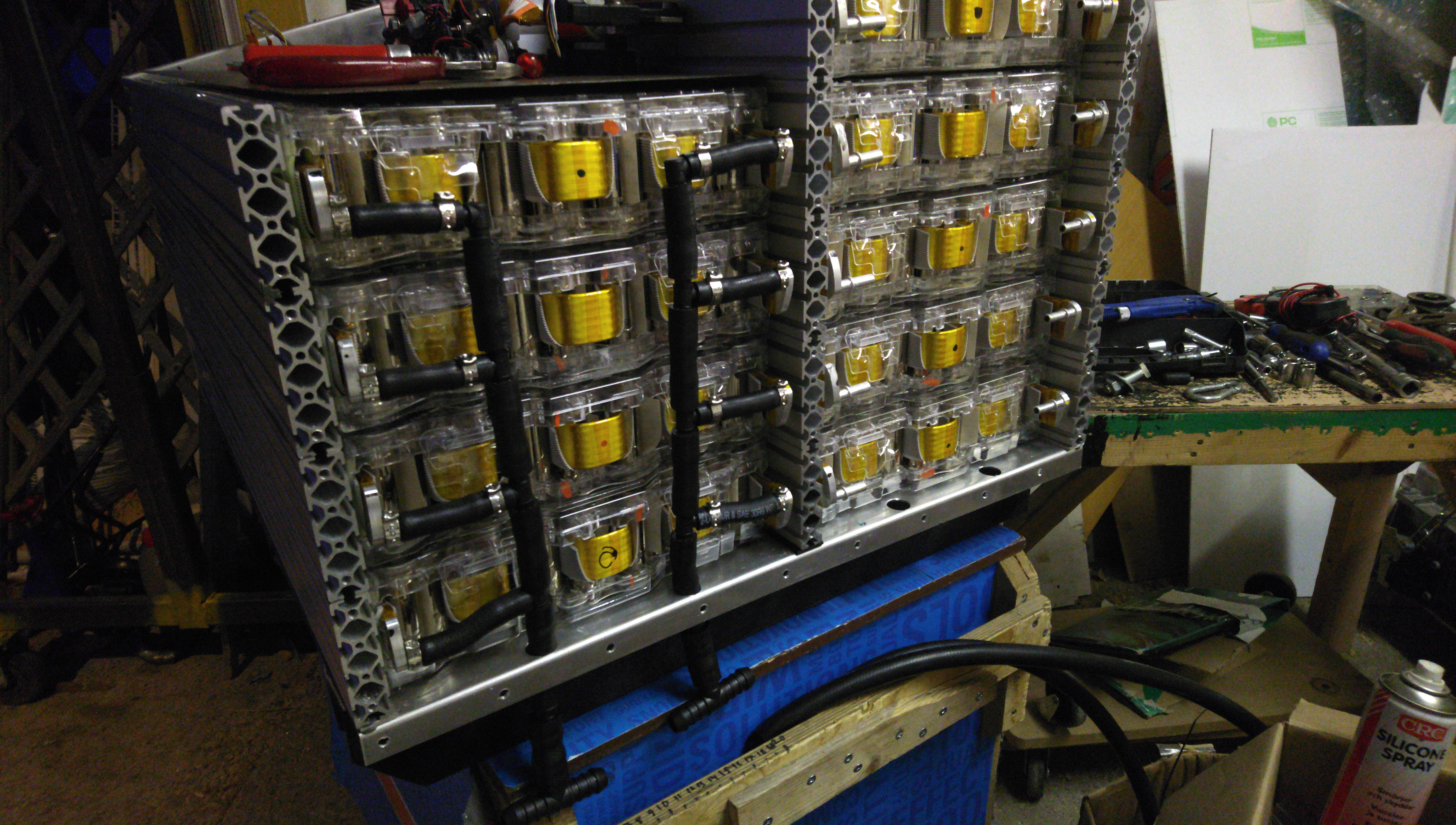 Turn the box around, and we have the scary side. Installing the module interconnects in this box is NOT enjoyable at all. There's very conductive very sharp alu profile very close to everything, the terminals are stacked on top of each other, the plumbing on the other end of the modules prevents pulling the modules forward much at all. Basically you just try to maintain focus and hope you'll die some other day for some other reason. And add lots of electrical tape on your spanner. And work with only one hand wherever possible.