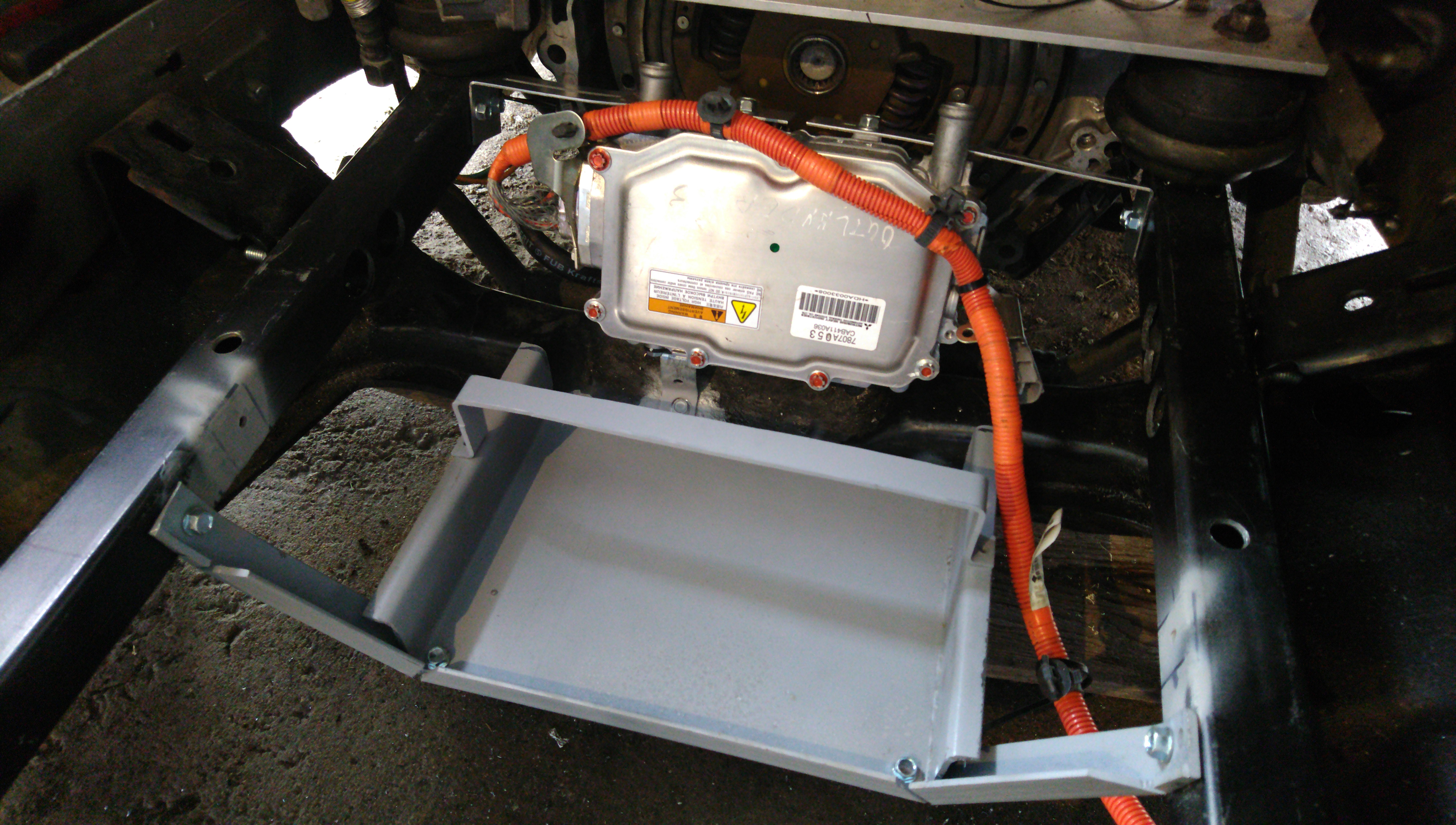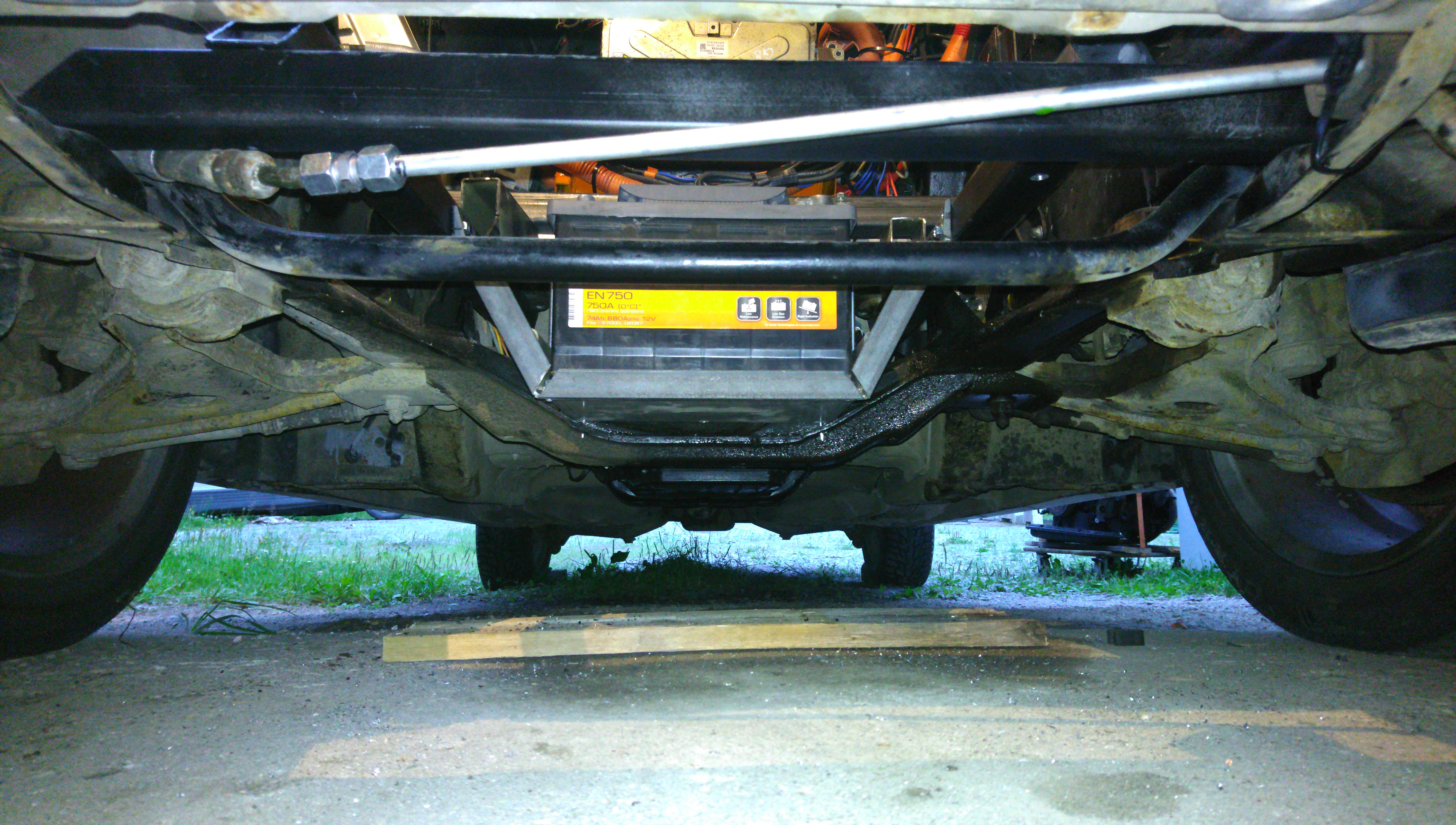 I have to house the HV junction box at the original 12V battery location. As the 12V battery isn't really a service item and I didn't want to run super thick 12V cables to the rear, I placed it underneath the front battery box, next to the cabin heater. These are both mounted now to my satisfaction, and, as I type this, the steel parts are getting accustomed to their new coat of paint.