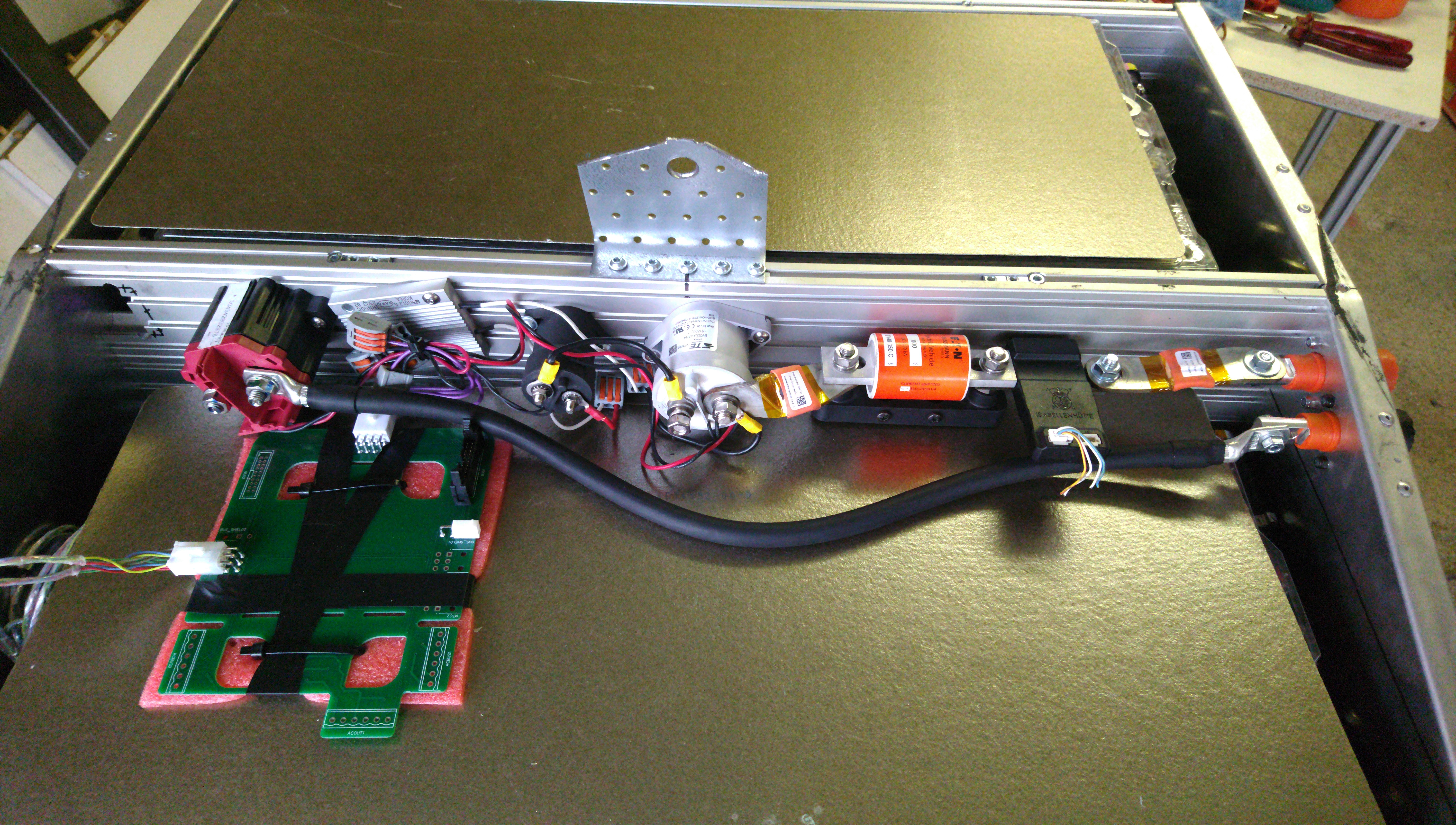 Installed HV stuff in the small space on top of the front battery box. The expensive alu profiles show an added benefit here, as I happened to have some of the appropriate cage nuts to go with them. How many? Only 1 left now. I'm that efficient. Also crimped two internal 50mm2 wires but didn't install yet.