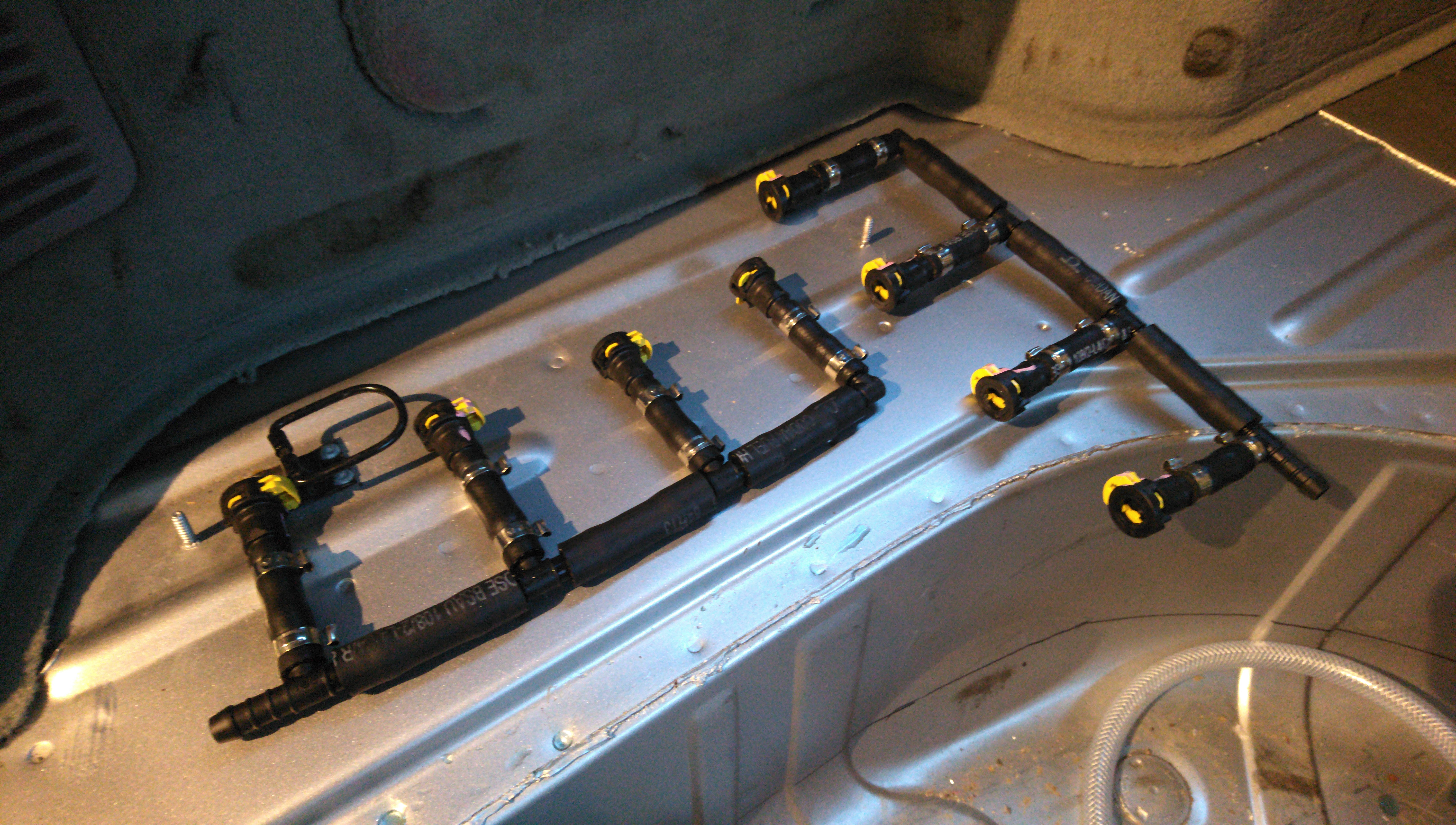 That's my plumbing chair and the end result for today. 4 done, 5 to go tomorrow, 4 more to go Some Time Later. It's not fun to install these kind of thick fuel hoses directly into the male connectors pretending they are hose nipples as the hoses Just Don't Want To Go, but it's possible with enough heat, trickery and brute force. Notice the unsystematic use of hose clamps? I'm leaving it like that.