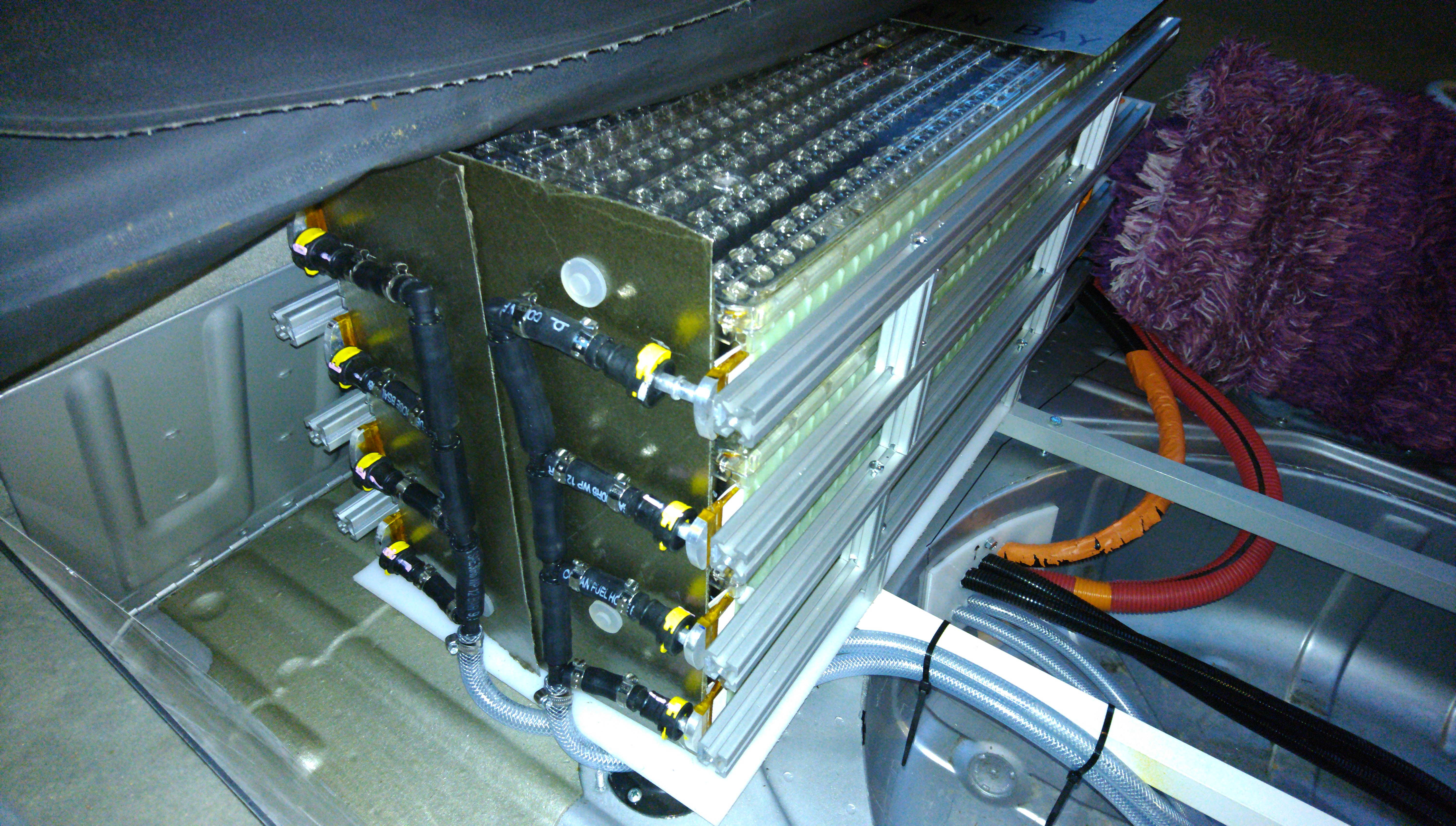 Hung a big bunch of cables and hoses to the bottom (what an absolute pain) and continued building a temporary rear battery pack. Later, the spare wheel well will be extended and this same pack will be lowered into it. Also, meanwhile working on the signal harnesses.