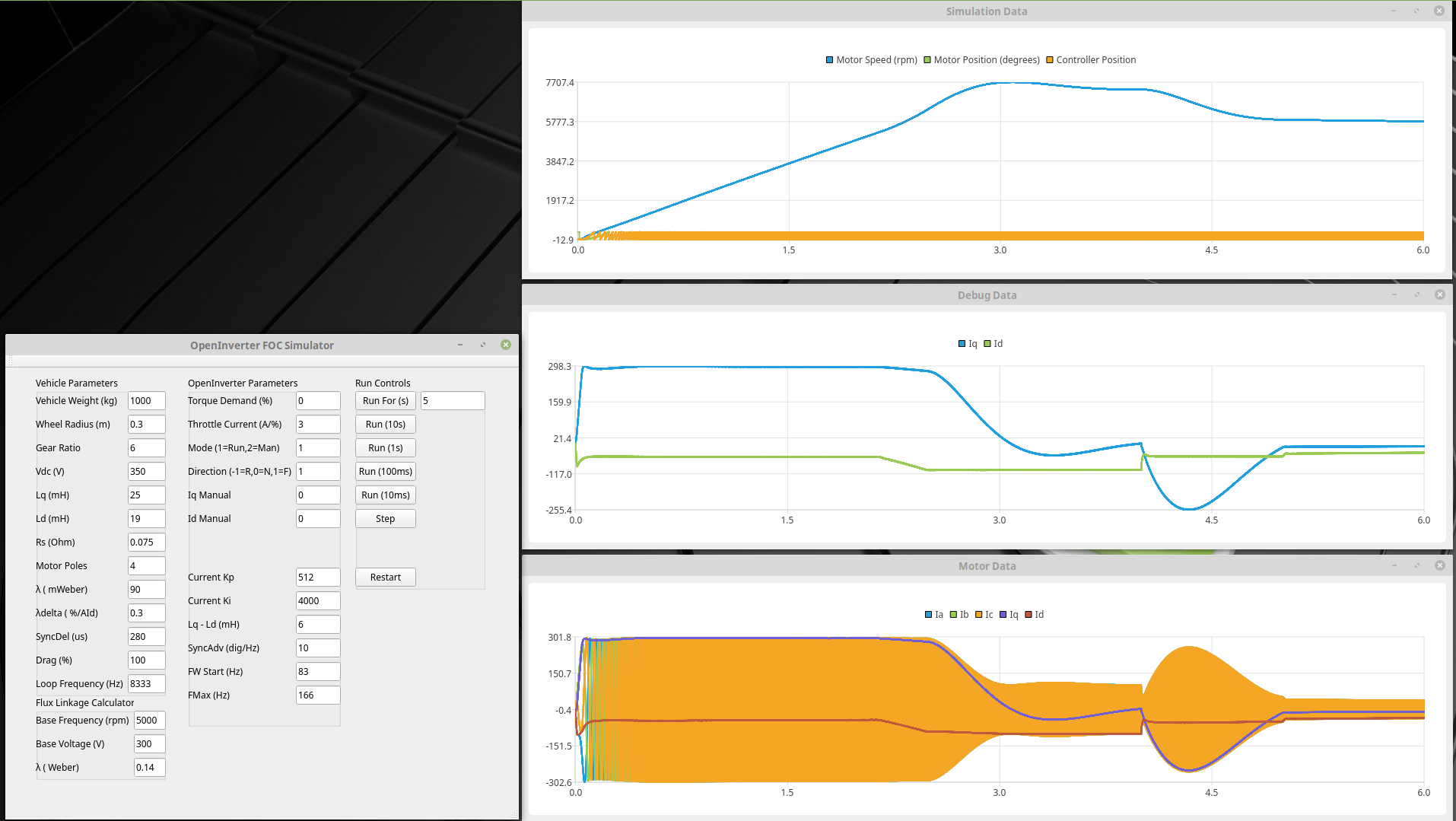 More plots! The last thing to sort out before I can look at the regen issue is to implement SyncAdv support. I've modded my model so that it can give out an offset position (controlled by the SyncDelay contol on the main window in us). The idea is that this can be tuned to compensate for the SyncAdv in the OpenInverter code and then allow the effect of discrepancies to be investigated.