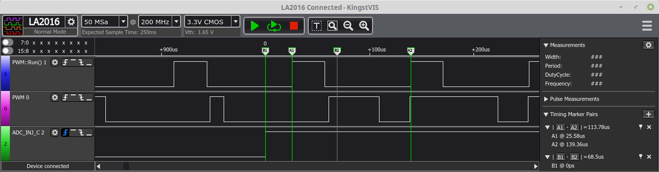 With that fixed I've got some promising results, latency down to 70us (A1-A2 is the period, B1-B2 the latency):