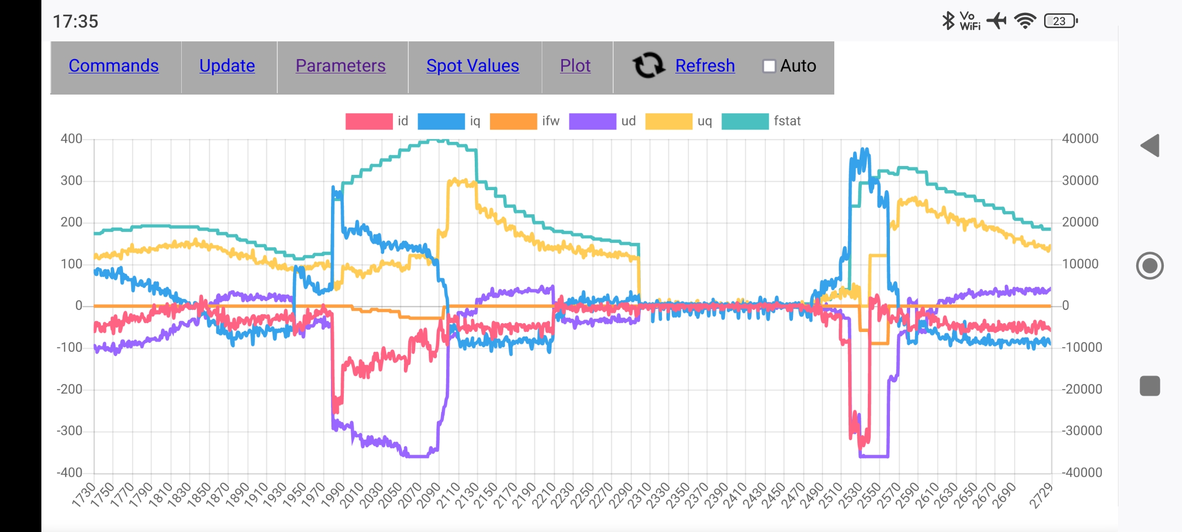 Just went for another test drive with fwmargin set to 6000 and fwkp=50 (which is really 50/32 because of scaling). Now we come alive! Unfortunately the FW controller oscillated strongly but when it oscillated towards much field weakening I could feel how much power is in there. Reducing fwkp leads to the controller outputting too little FW current (fwkp=5 on the left side, 15 on the right side). So I think adding fwki might help here.