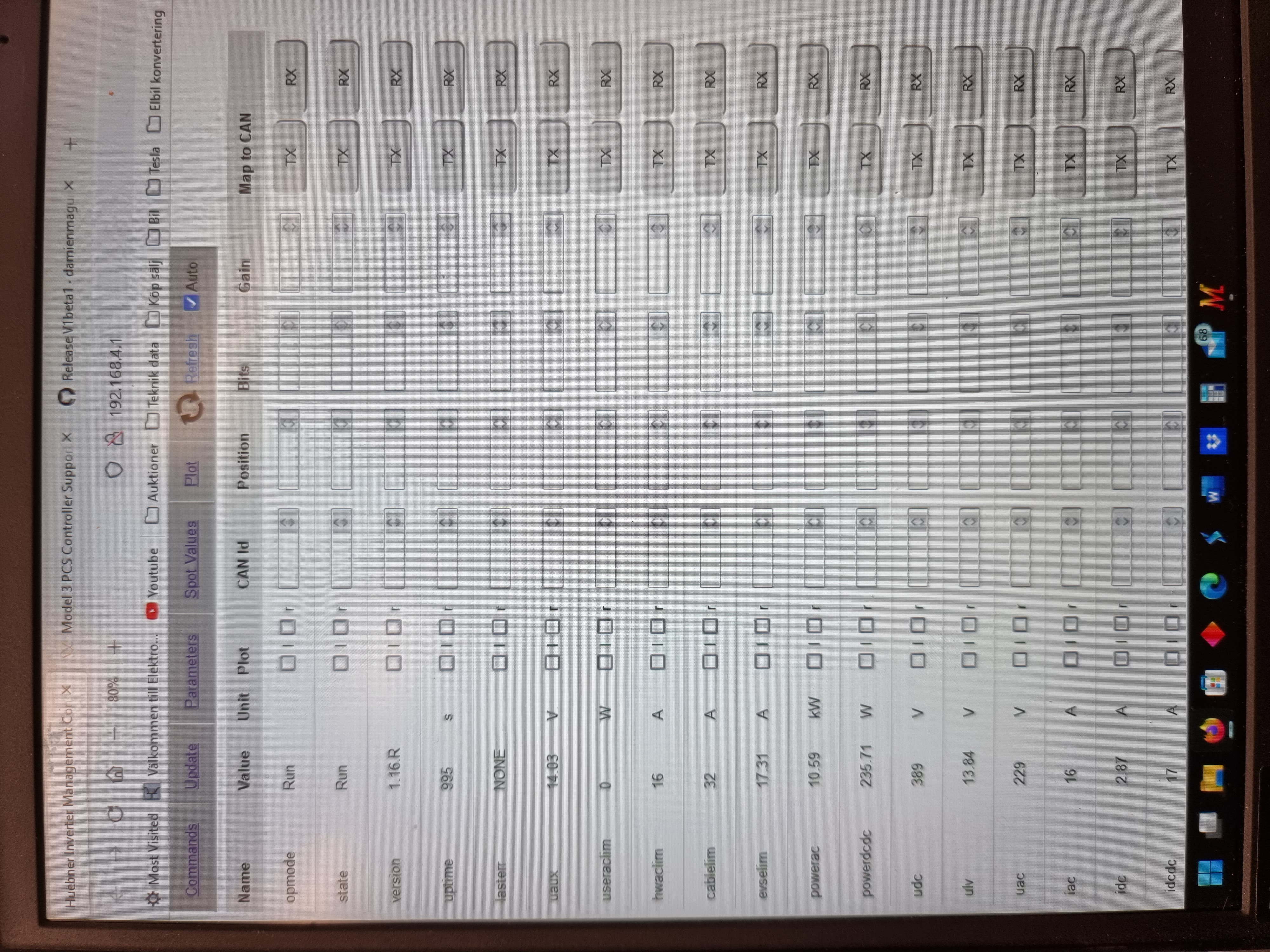 Set udcdc to 13.5V and apply enable in manual mode. PCS jumps into gear and 13.5V reported in the web interface. After a short time, a high pitched whine starts coming from the PCS (got excited thinking the GS450H inverter finally woke up :D ). The volume of the whine increased over a few seconds then stopped and the PCS shut down the DC-DC. This happened a couple of times and I suspected it might be that the 12V battery was still on the low charge side (alerts: 76dcdcEnDeassertedErr, 67dcdcLvRatuionality, 38claFaulted, 50dcdc12VSupportFaulted). After some restarts I changed udcdc to 14V and the PCS DC-DC worked away happily after that. It did happen once more later on when I was trying to test both DC-DC and Charging at the same time. But happily, DC-DC was working on the bench and I didn't blow anything up!