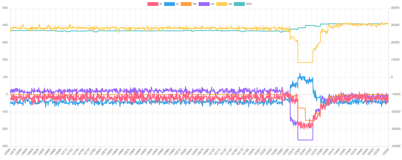 Been wondering about this, is it possible that on some motors the -Id added by Mtpa is enough to do fw while on the accelerator? If so you would only see FW come in during coasting or deceleration above base frew and I don't see much of that in the plot. It would be interesting to see the Uq and Ud voltages on the plot too as that would show whether Ifw should have been added.