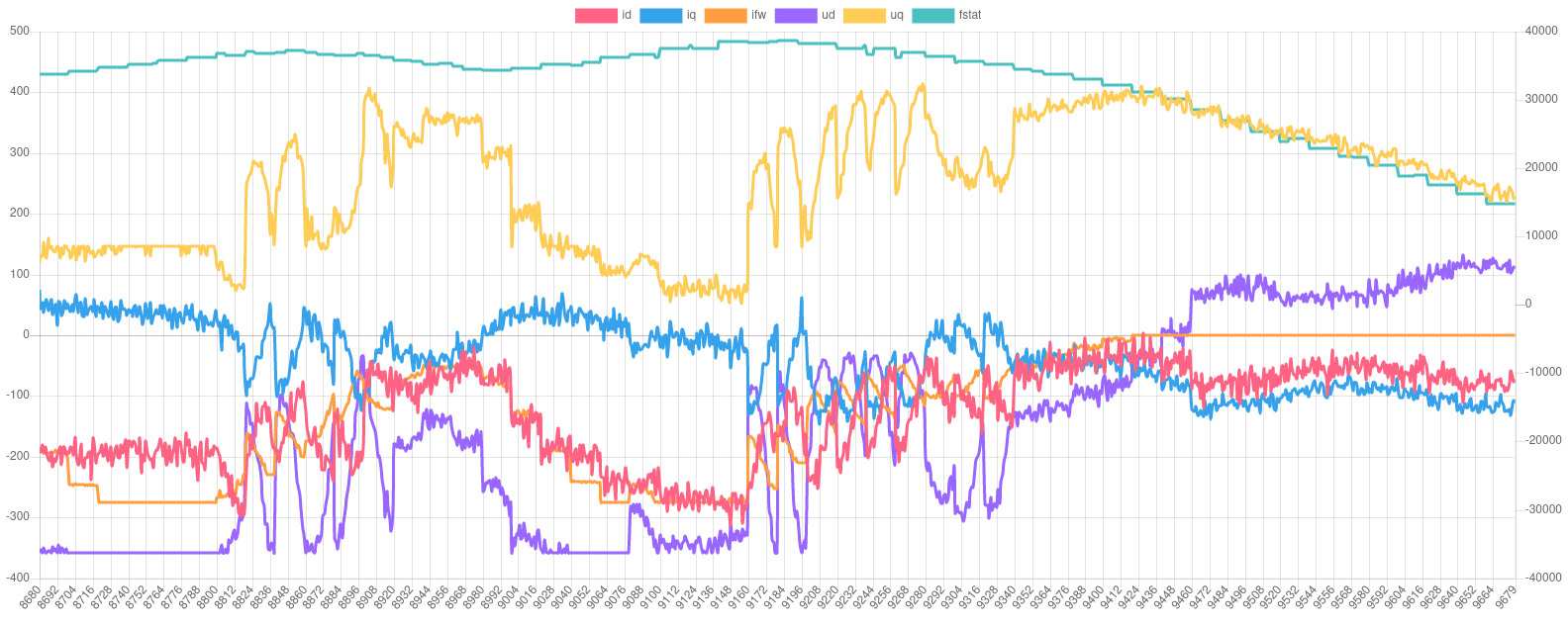 Been wondering about this, is it possible that on some motors the -Id added by Mtpa is enough to do fw while on the accelerator? If so you would only see FW come in during coasting or deceleration above base frew and I don't see much of that in the plot. It would be interesting to see the Uq and Ud voltages on the plot too as that would show whether Ifw should have been added.
