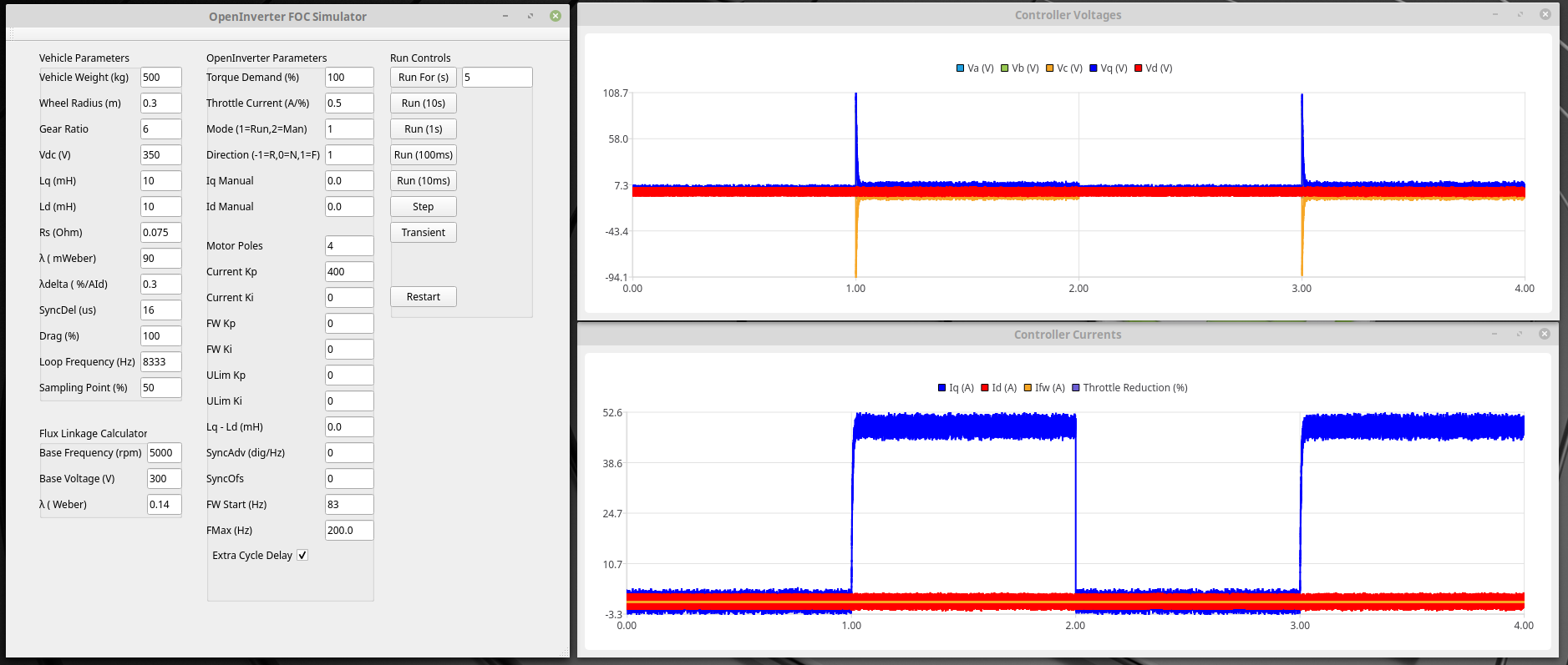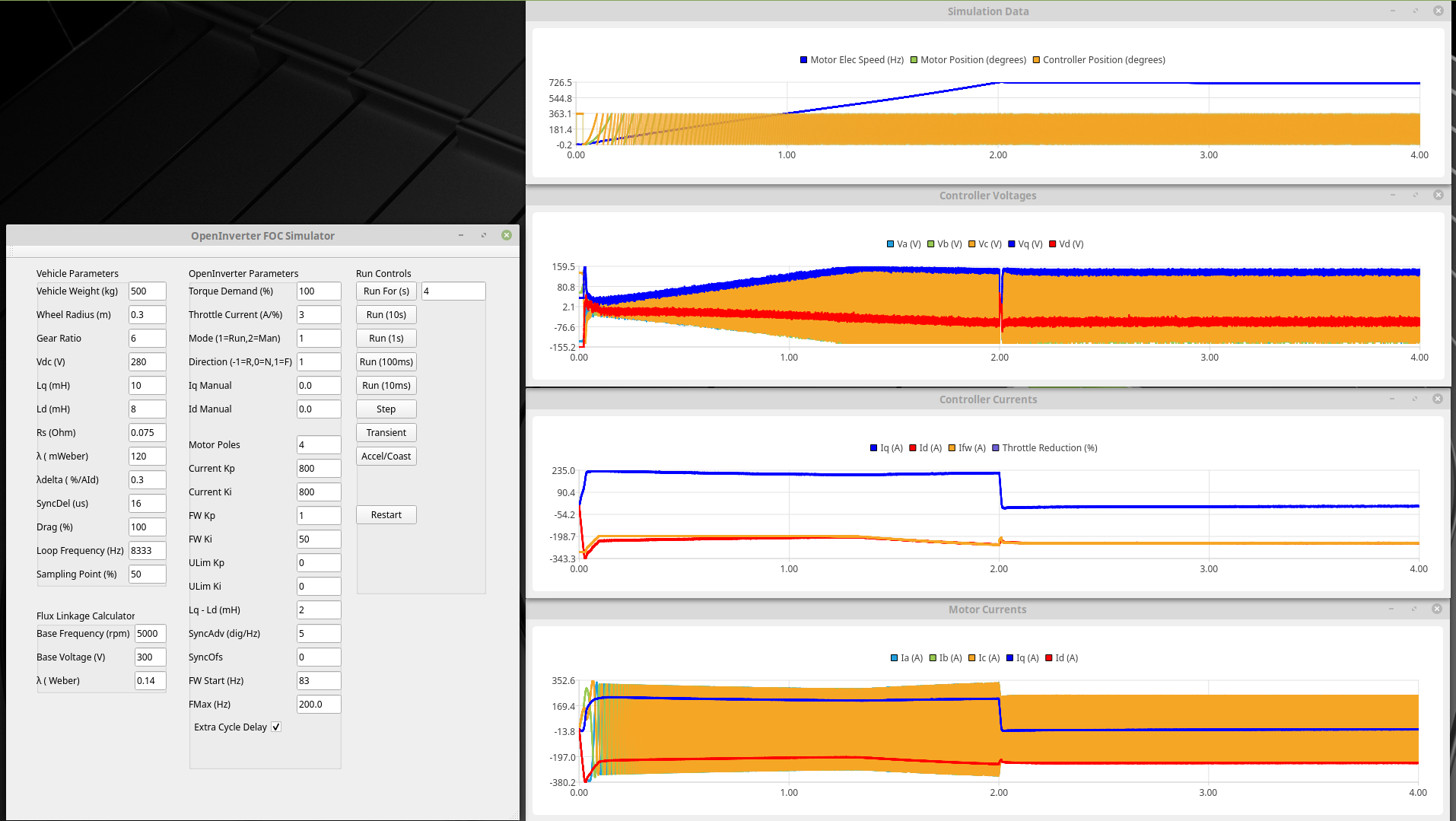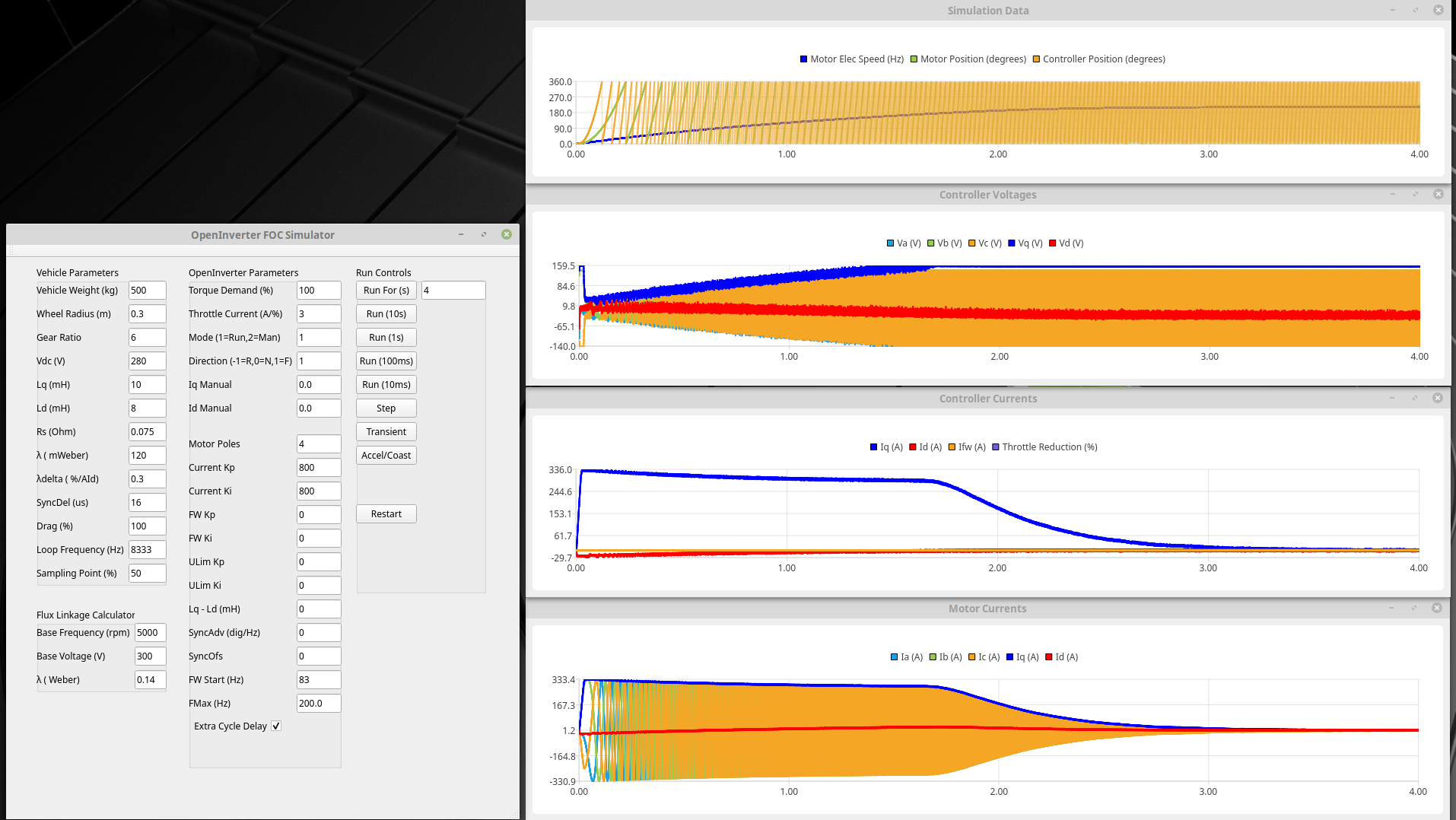 Pretty sure now that you are hitting base frequency. The simulation has convinced me that the -Id from Mtpa is quite effective at FW and allows you to push well past base frequency. The trouble is when you then come off the power the Mtpa -Id disappears, the FW disappears and you get the regen.Ev8 wrote: ↑Sat Sep 17, 2022 1:38 pm Yes it will slowly accelerate over 2.5kprm with mtpa turned off but with it on and set to 1mH and 150mwebber it happily accelerates strongly up to 5krpm which is my cut Rev limit, I’d like to achieve 6k if possible so I can hit over 60mph in a single gear but it’s not crucial, a stable 5k would be fine by me, swapping between 3’rd and 4th gear to go on fast roads isn’t an issue.