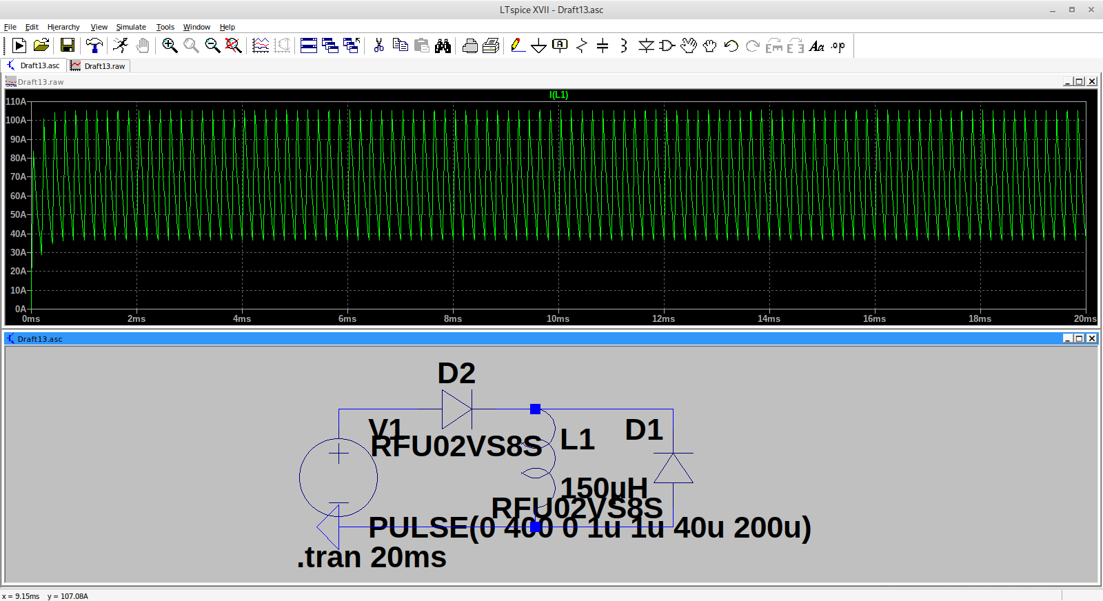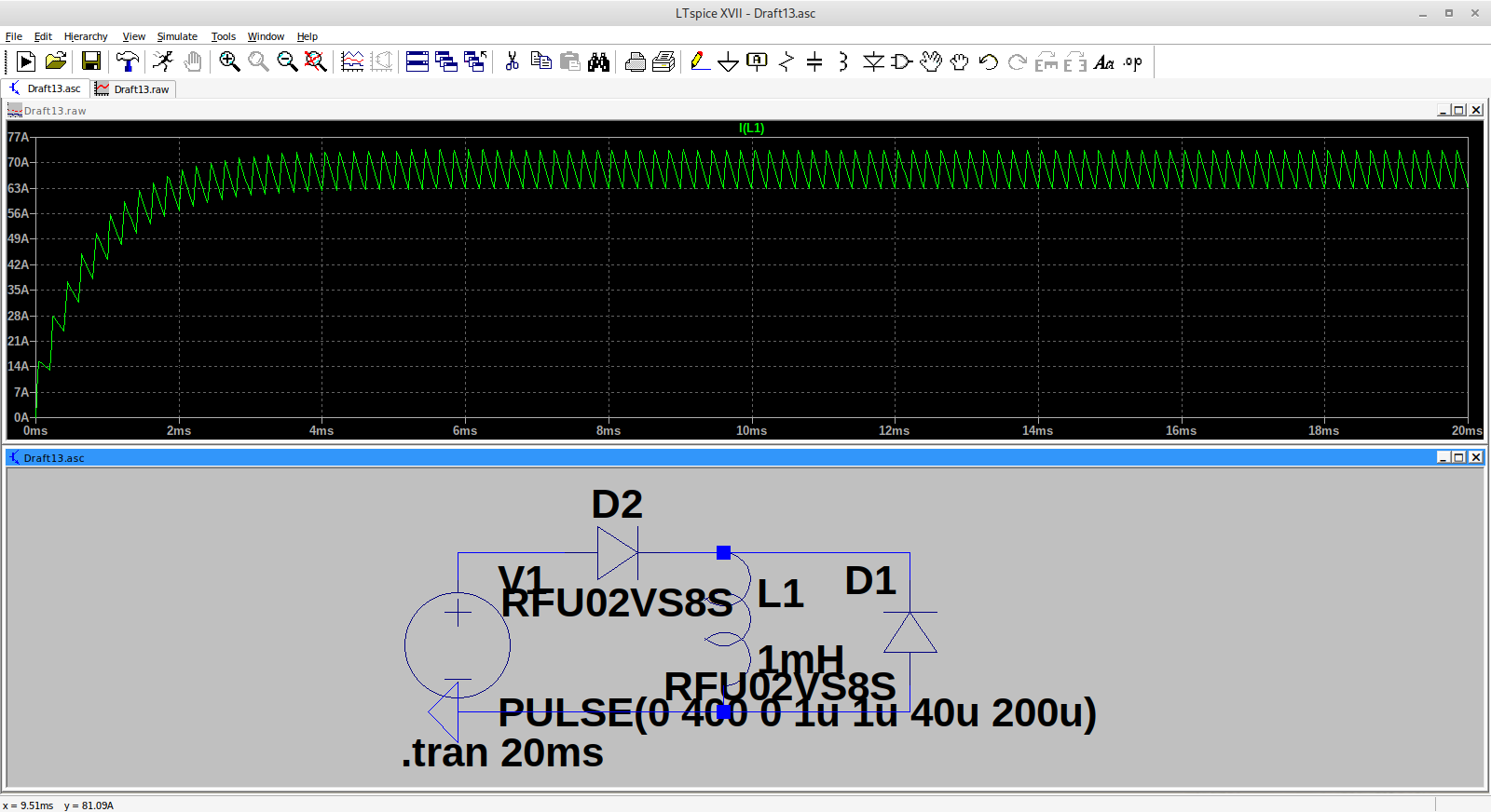 Think for now I'm going to use the Leaf 300A values (330uH and 100uH) and experiment a bit more with the simulation. There is something odd going on from stationary (very high currents, just for a few ms) which might explain the trips people have experienced?
