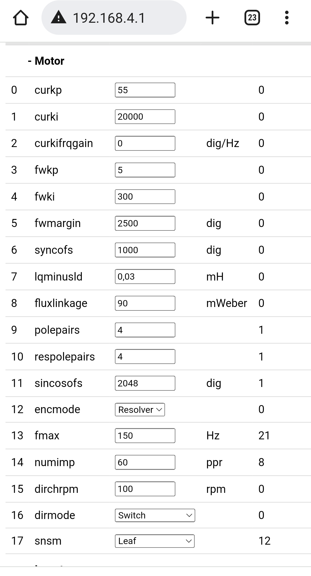 Those numbers are more like the ones I found when starting to look at this and why I've been using higher values. They are for smaller motors though. My original thought was that larger motors would have larger inductance but I'm wondering if it is the other way round? Using your motor, the PMSM motor and the Leaf data it looks more like inductance may be inversely related to operating current, which makes sense in some ways?