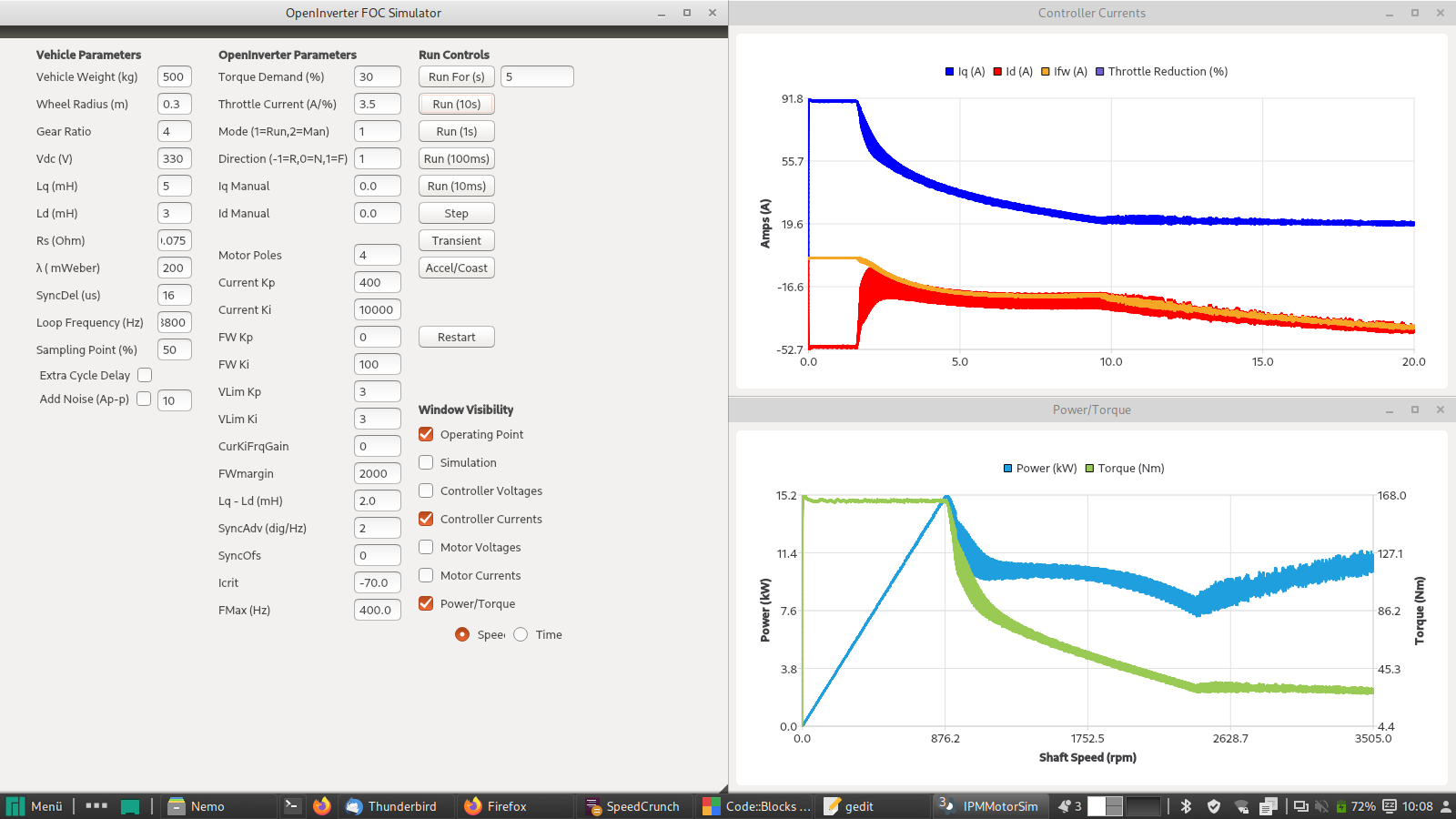It was a conscious decision, I'm treating it kind of like a safety margin, if the loops can cope with that then they should have a reasonable margin for stability. I'll add a check box to enable ramps though so that the effect can be seen.johu wrote: ↑Mon Oct 31, 2022 9:10 am One thing I noticed is the simulator doesn't seem to do throttle ramping. So if I go from 100 to 0 it does it right away and controllers don't like that. A typical ramp rate is 5%/10ms and 0.5%/10ms for regen. Can you put that in? Also would be nice if the Accel/Coast test did the same and could be run for some custom time (maybe from the top runtime field)
