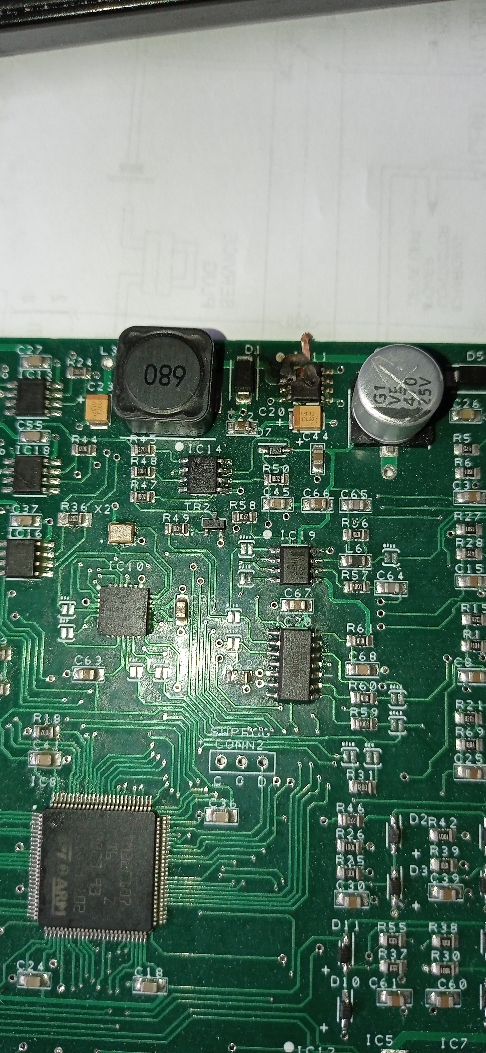 The burned track from C29 to IC11 is 12v+, this is converted to 5V + by IC11, C20, C22 and D1, this 5v is then smoothed through L3 and goes on to power the 5V side of the board. The 12v side is split at the positive of C29 and powers the rest of the 12v needs of the board.