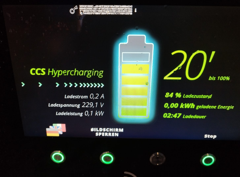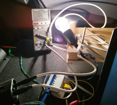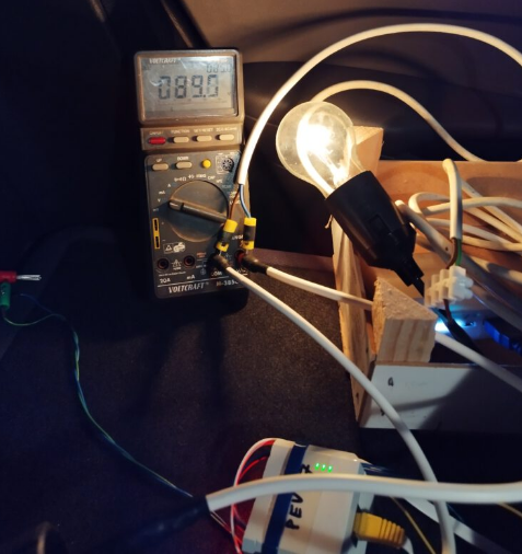 Today was the first time, when I was able to get some power from an Compleo 50kW triple charger. Used a 230V light bulb as load, the TPlink as modem, an arduino for switching the CP state, and the laptop as controller. The auto-ranging multimeter was not able to deal with the 400V DC, it shows "overload". But the bulb survived the voltage. The plan was, to NOT connect the bulb during the cable check, but by mistake it was turned-on already. Later, the PreCharge tries to rise the voltage, but this aborts at around 90V.